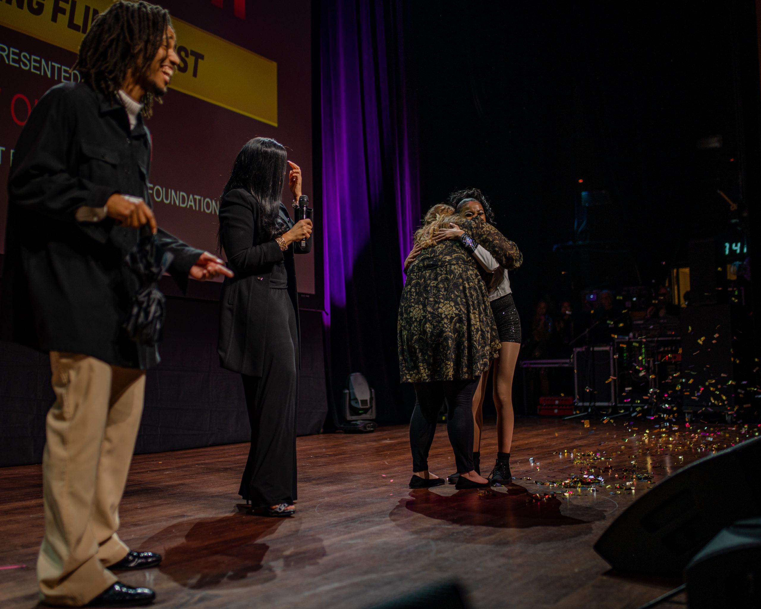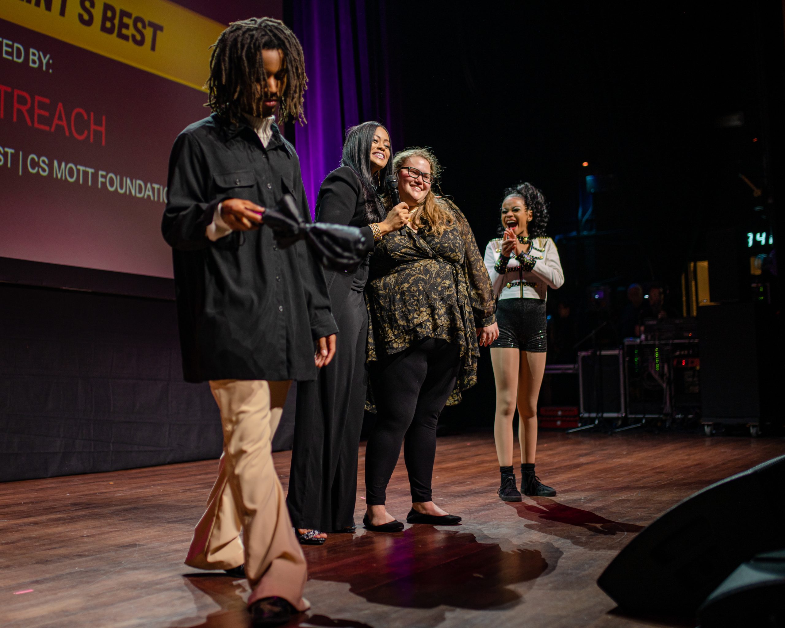 WNEM news anchor Colette Boyd (center, left) congratulates Ava Safley (center, right) for winning WOW Outreach’s Flint’s Got Talent showcase at the Capitol Theatre in Flint, Mich. on Friday, Dec. 16, 2022. (Michael Indriolo | Flint Beat)