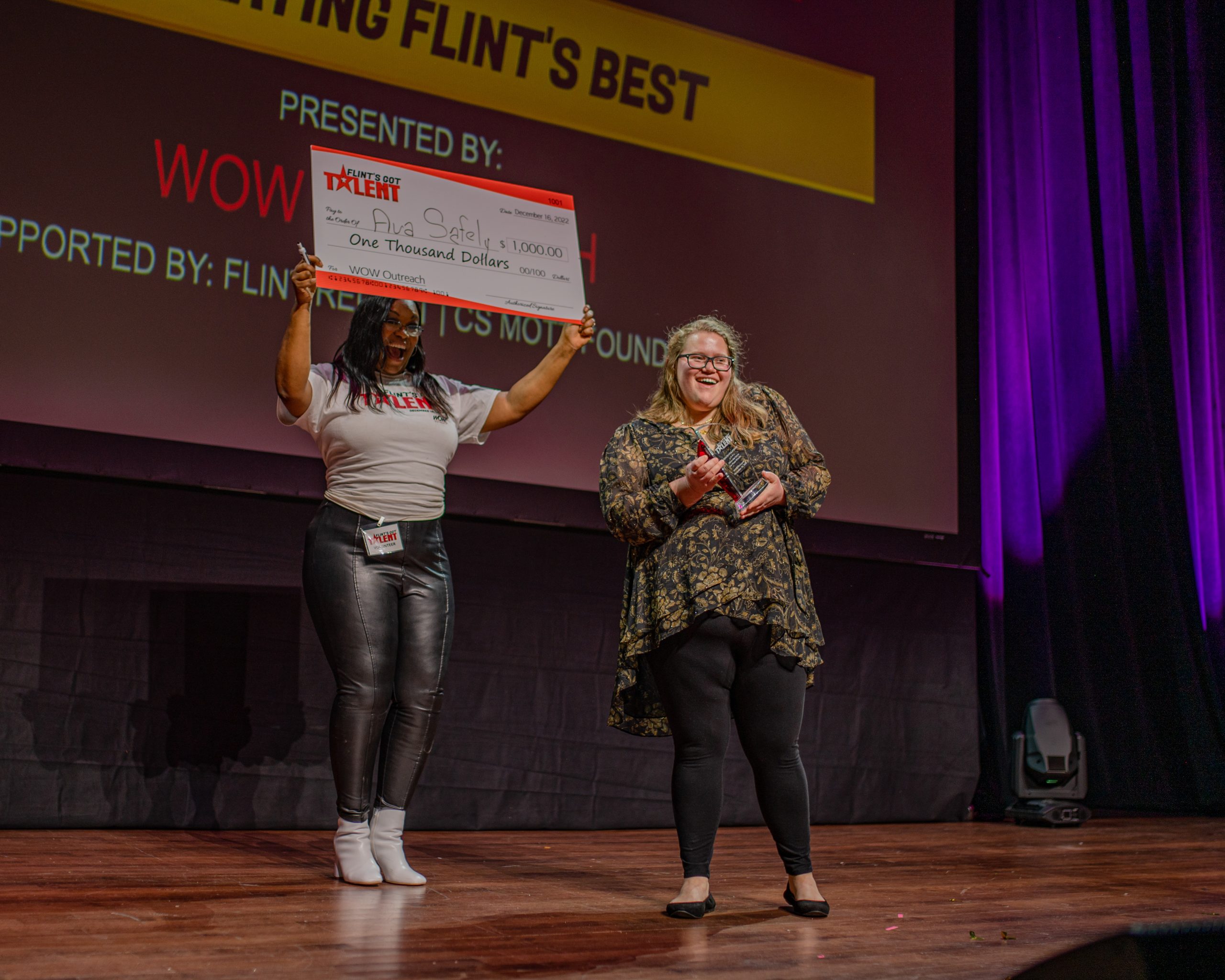 Ava Safley is presented with a check for $1,000 for winning WOW Outreach’s Flint’s Got Talent showcase at the Capitol Theatre in Flint, Mich. on Friday, Dec. 16, 2022. (Michael Indriolo | Flint Beat)