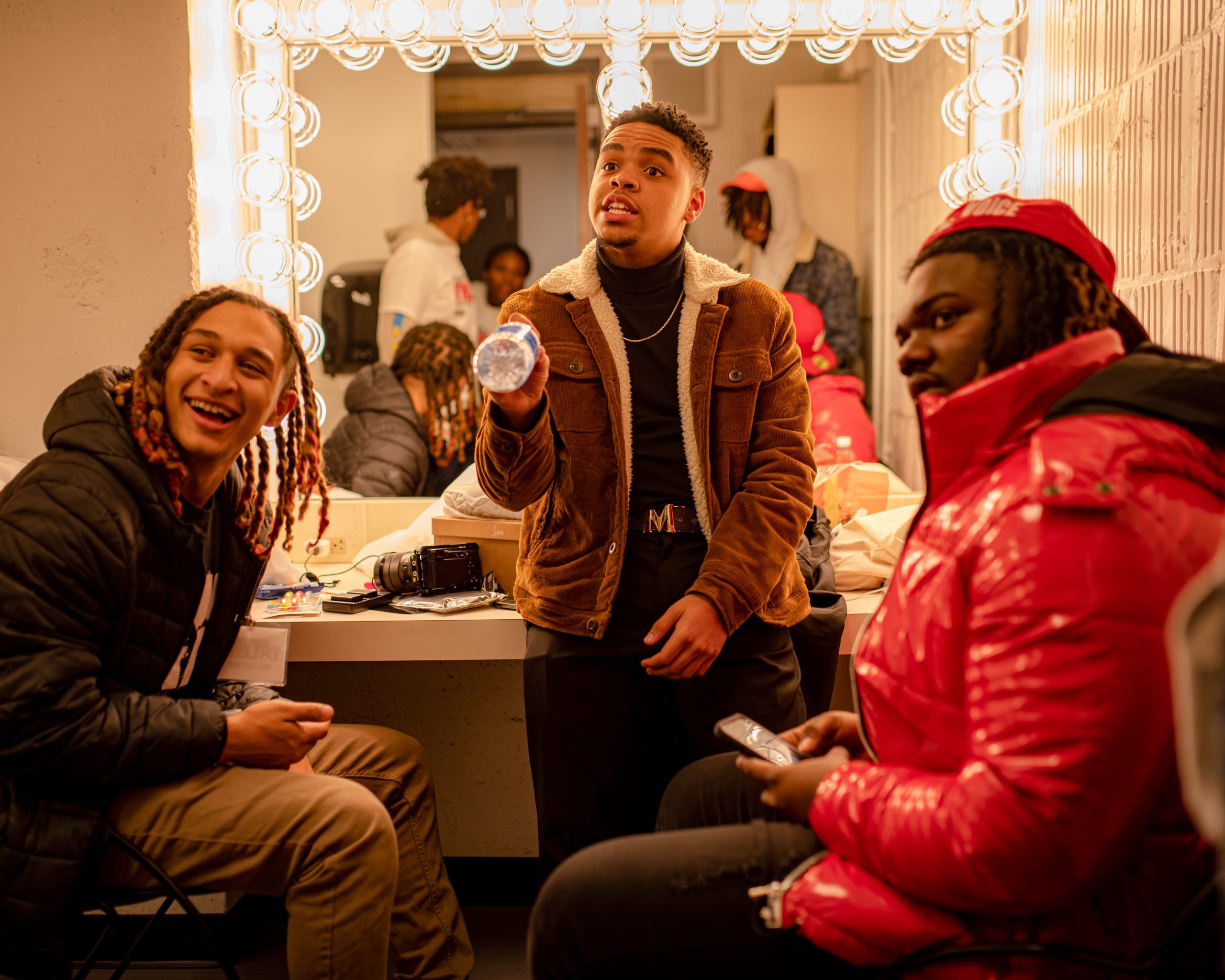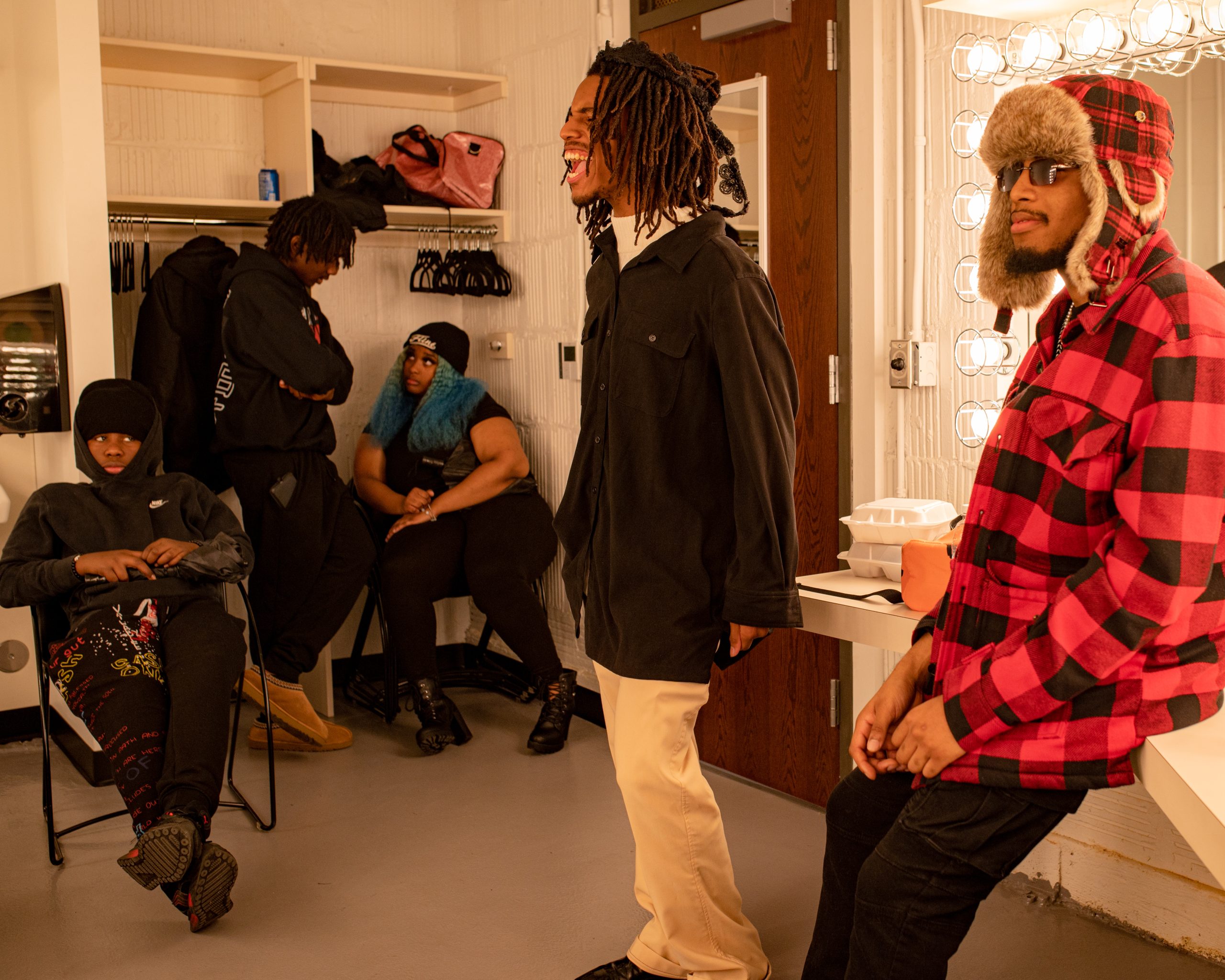 Wutae World (center), Isaiah “Jaddai” Baker (right), and other artists and friends hang out in their dressing room ahead of WOW Outreach’s Flint’s Got Talent showcase at the Capitol Theatre in Flint, Mich. on Friday, Dec. 16, 2022. (Michael Indriolo | Flint Beat)