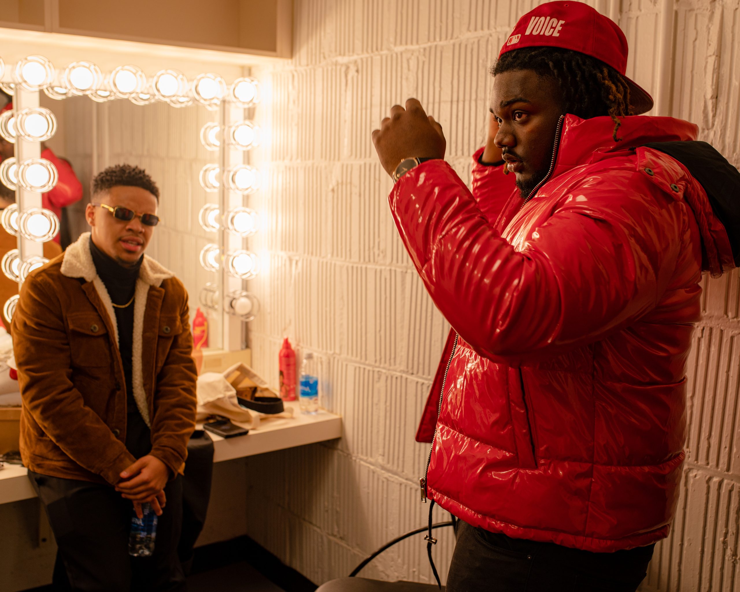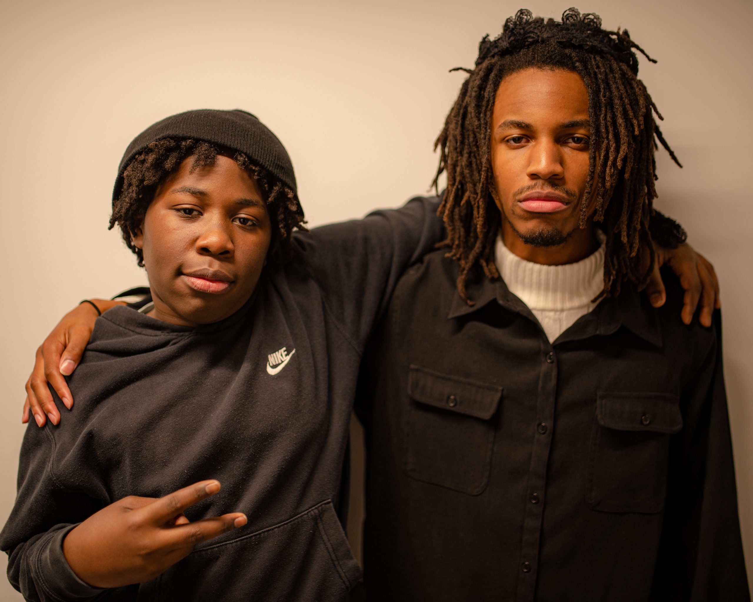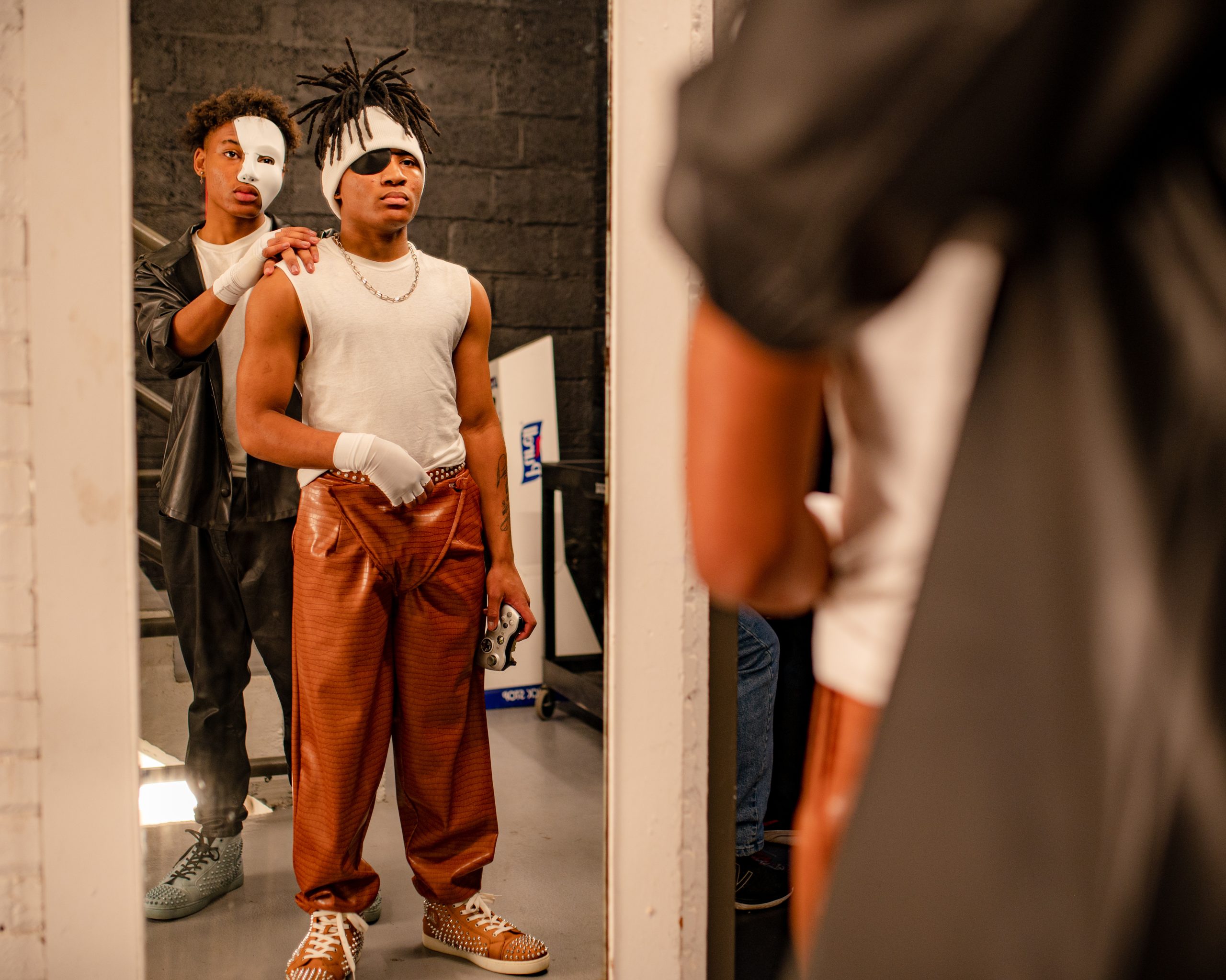 Chris “Butter” Brown Pinson and Kameron “King Kam” Motley hang out in their dressing room ahead of WOW Outreach’s Flint’s Got Talent showcase at the Capitol Theatre in Flint, Mich. on Friday, Dec. 16, 2022. (Michael Indriolo | Flint Beat)