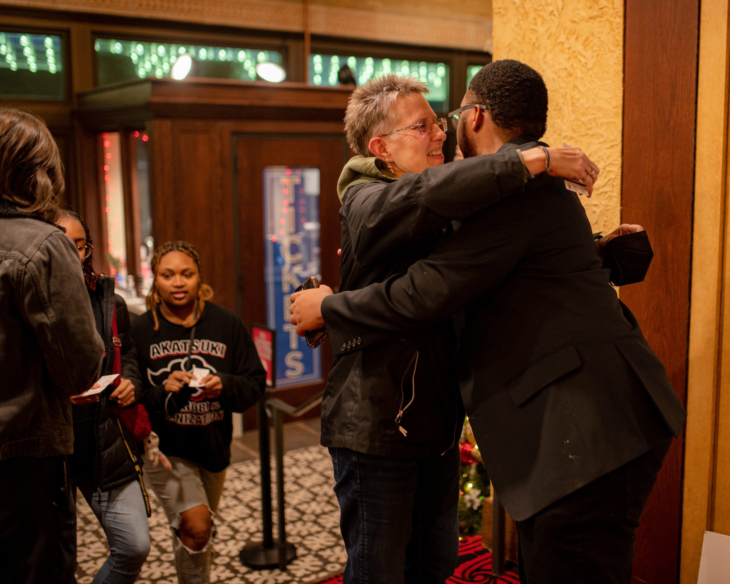 Antonio Sweeney, returning to Flint, Mich. for the holiday after his first semester at Morehouse College, hugs a former high school teacher ahead of WOW Outreach’s Flint’s Got Talent showcase at the Capitol Theatre in Flint, Mich. on Friday, Dec. 16, 2022. (Michael Indriolo | Flint Beat)