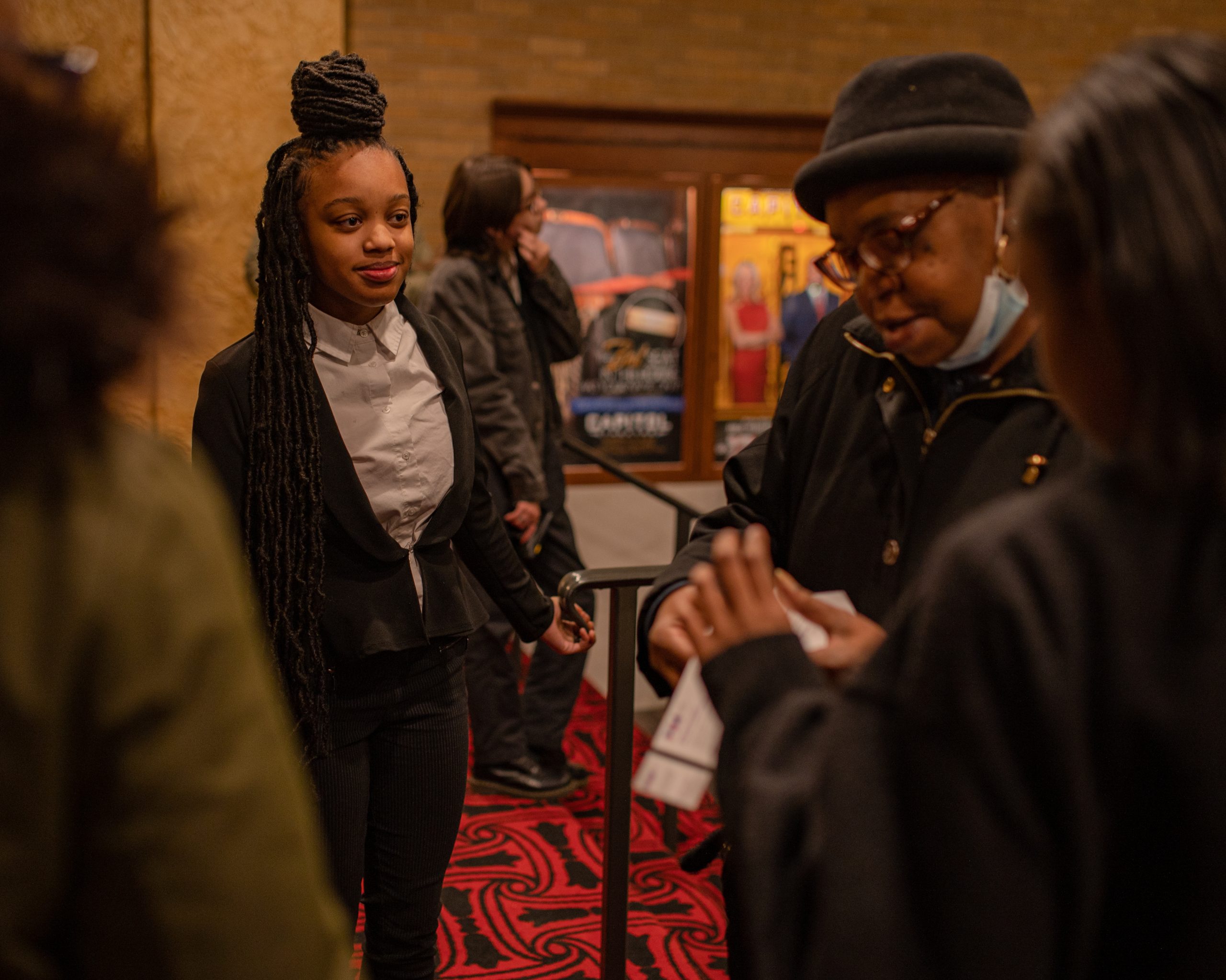 Jasmine Smith and Senaih Wellons check tickets ahead of WOW Outreach’s Flint’s Got Talent showcase at the Capitol Theatre in Flint, Mich. on Friday, Dec. 16, 2022. (Michael Indriolo | Flint Beat)