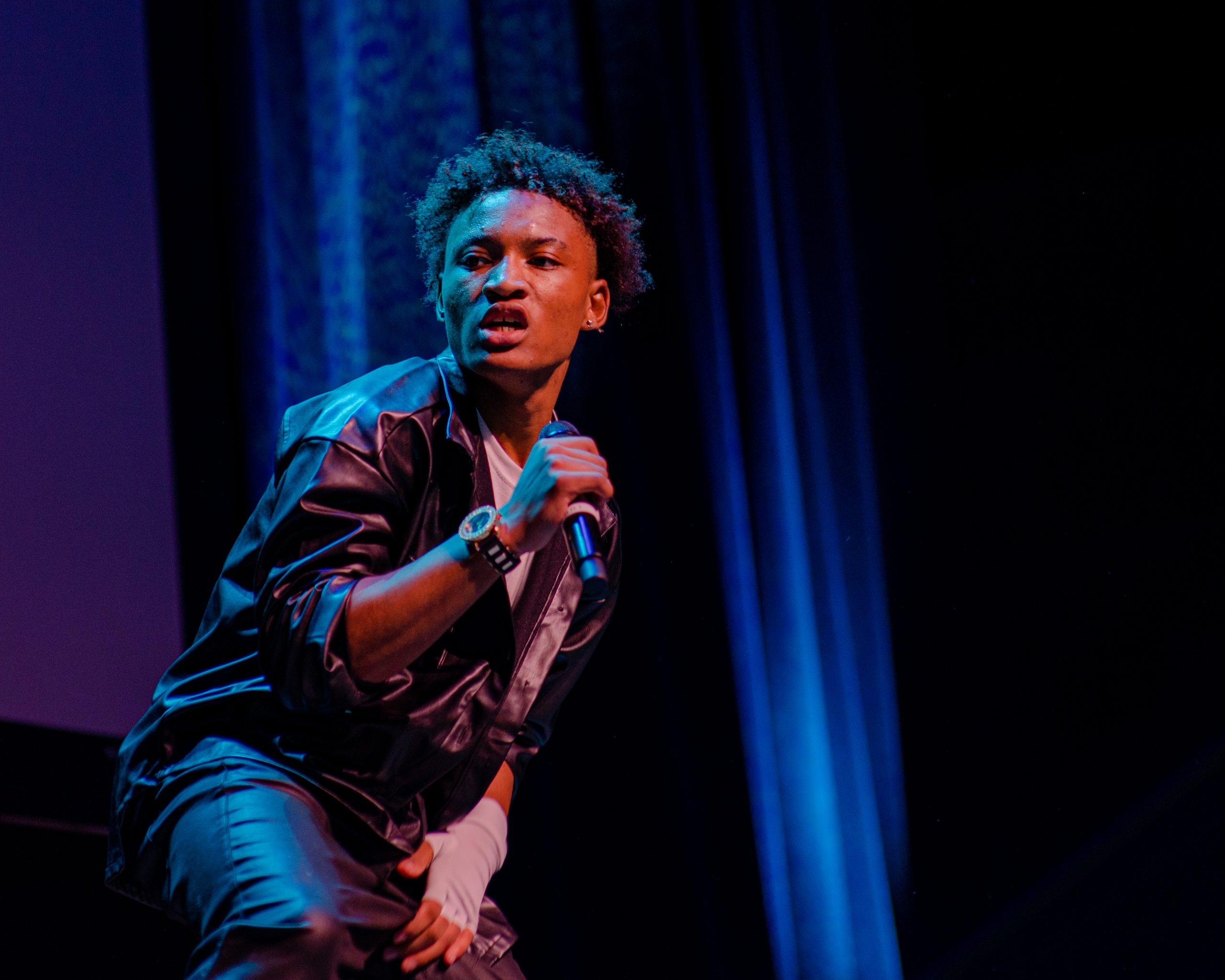 Kameron ” King Kam’ Motley performs during WOW Outreach’s Flint’s Got Talent showcase at the Capitol Theatre in Flint, Mich. on Friday, Dec. 16, 2022. (Michael Indriolo | Flint Beat)