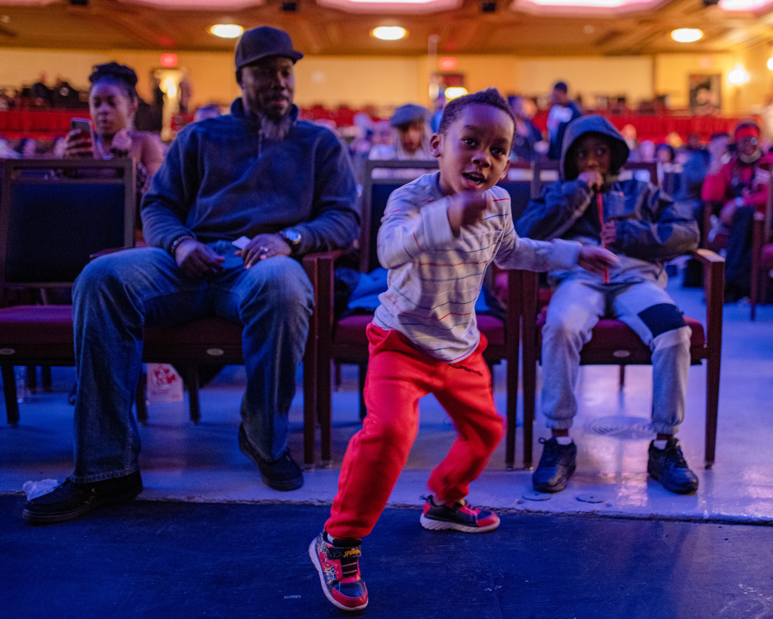 James McDonald (center) dances ahead of WOW Outreach’s Flint’s Got Talent showcase at the Capitol Theatre in Flint, Mich. on Friday, Dec. 16, 2022. (Michael Indriolo | Flint Beat)