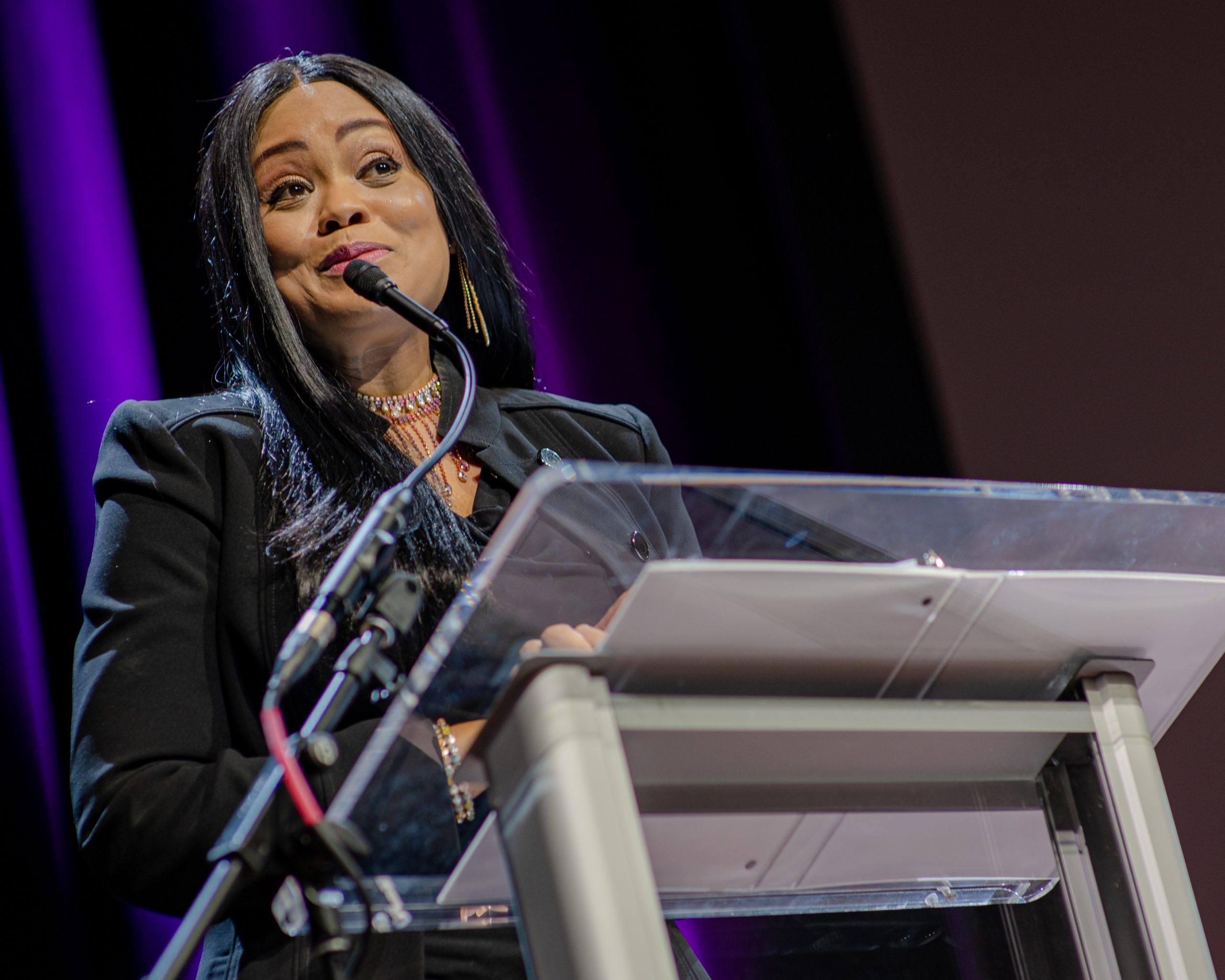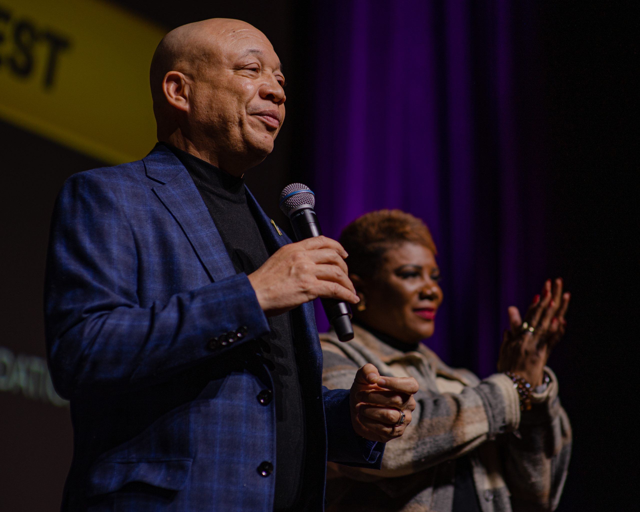 Flint Mayor Sheldon Neeley (left) and Michigan State Rep. Cynthia Neeley (right) give speak to the audience ahead of WOW Outreach’s Flint’s Got Talent showcase at the Capitol Theatre in Flint, Mich. on Friday, Dec. 16, 2022. (Michael Indriolo | Flint Beat)