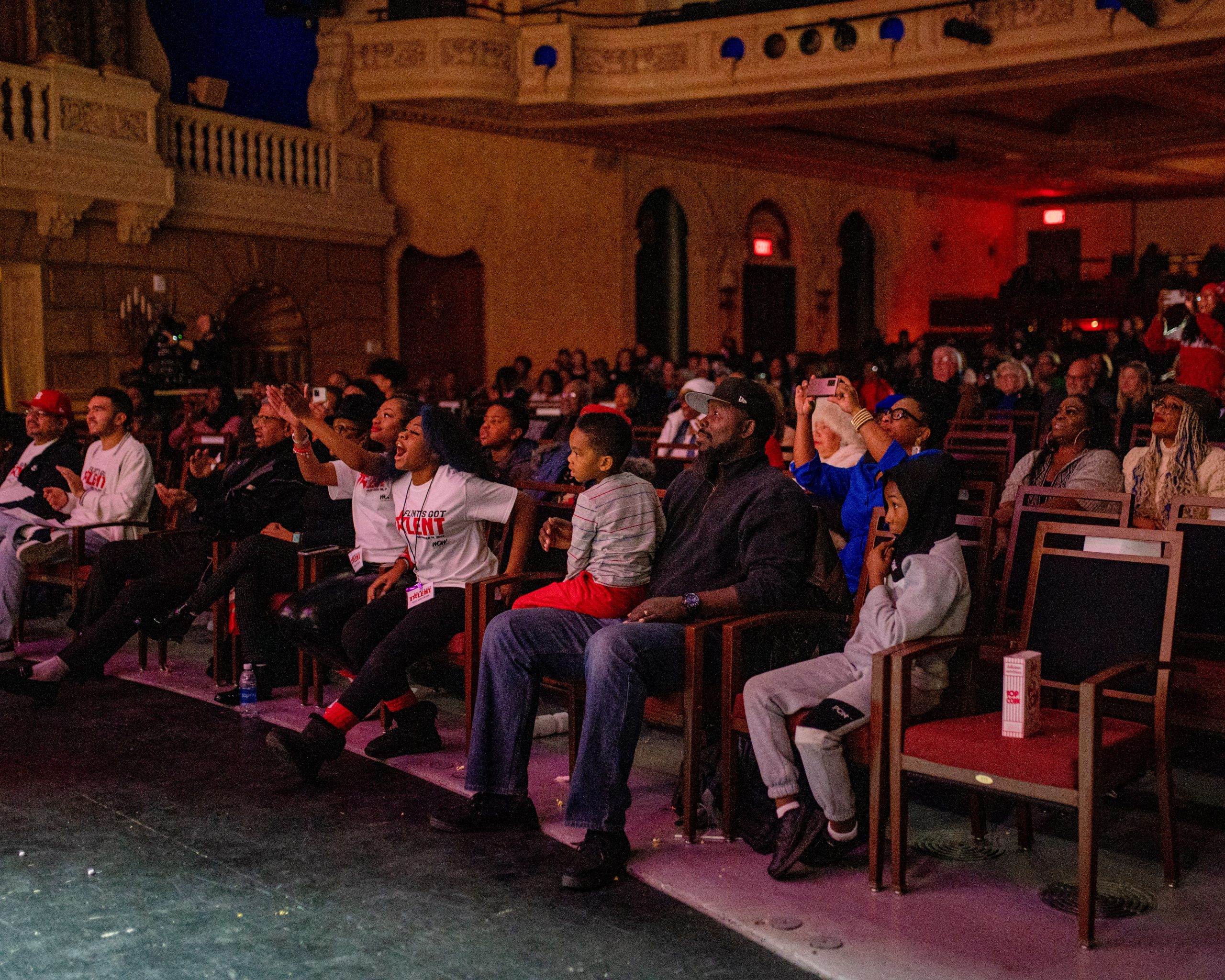 Audience members cheer as the the contestants all come on stage together during WOW Outreach’s Flint’s Got Talent showcase at the Capitol Theatre in Flint, Mich. on Friday, Dec. 16, 2022. (Michael Indriolo | Flint Beat)