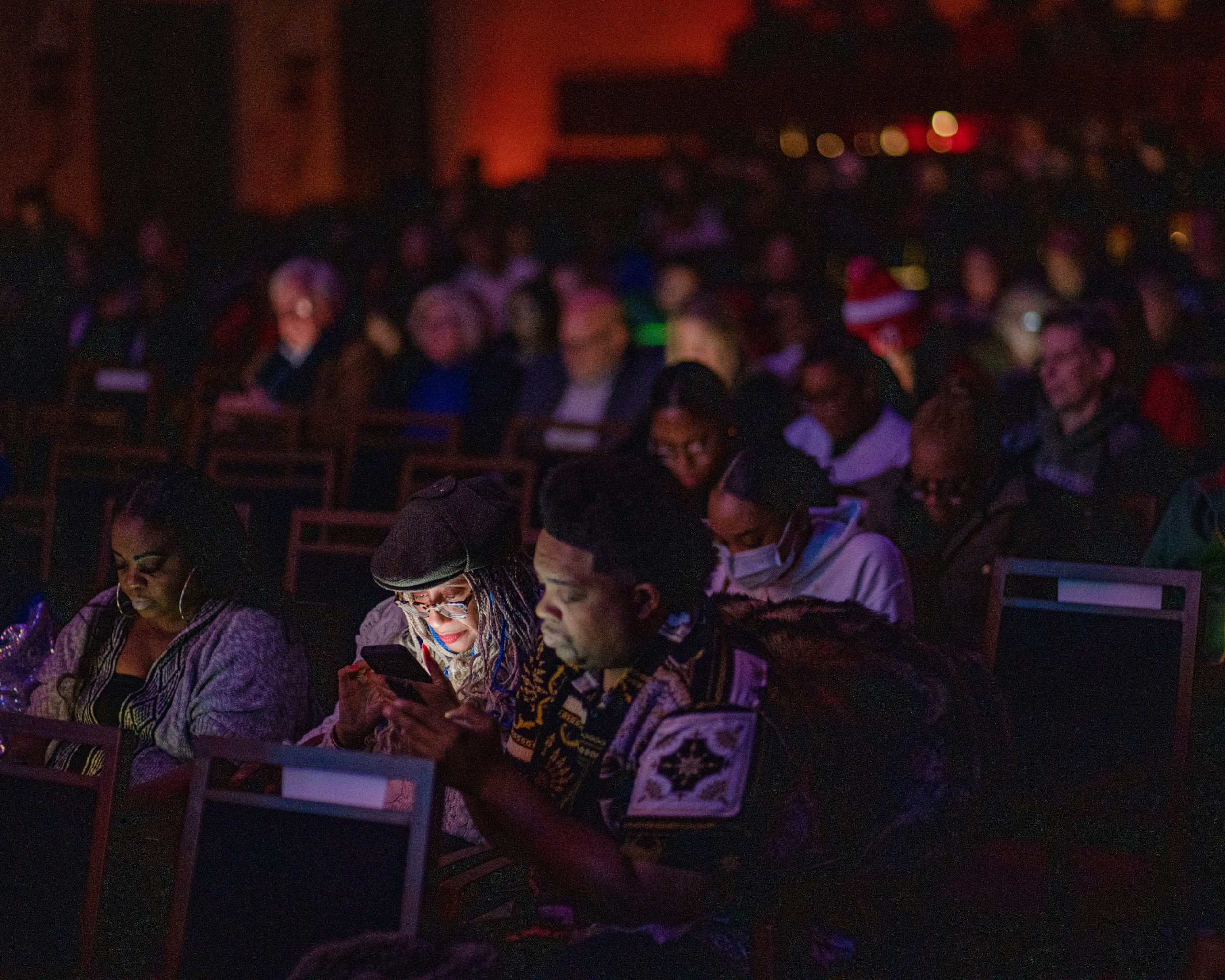 Audience members vote for their favorite artists during WOW Outreach’s Flint’s Got Talent showcase at the Capitol Theatre in Flint, Mich. on Friday, Dec. 16, 2022. (Michael Indriolo | Flint Beat)