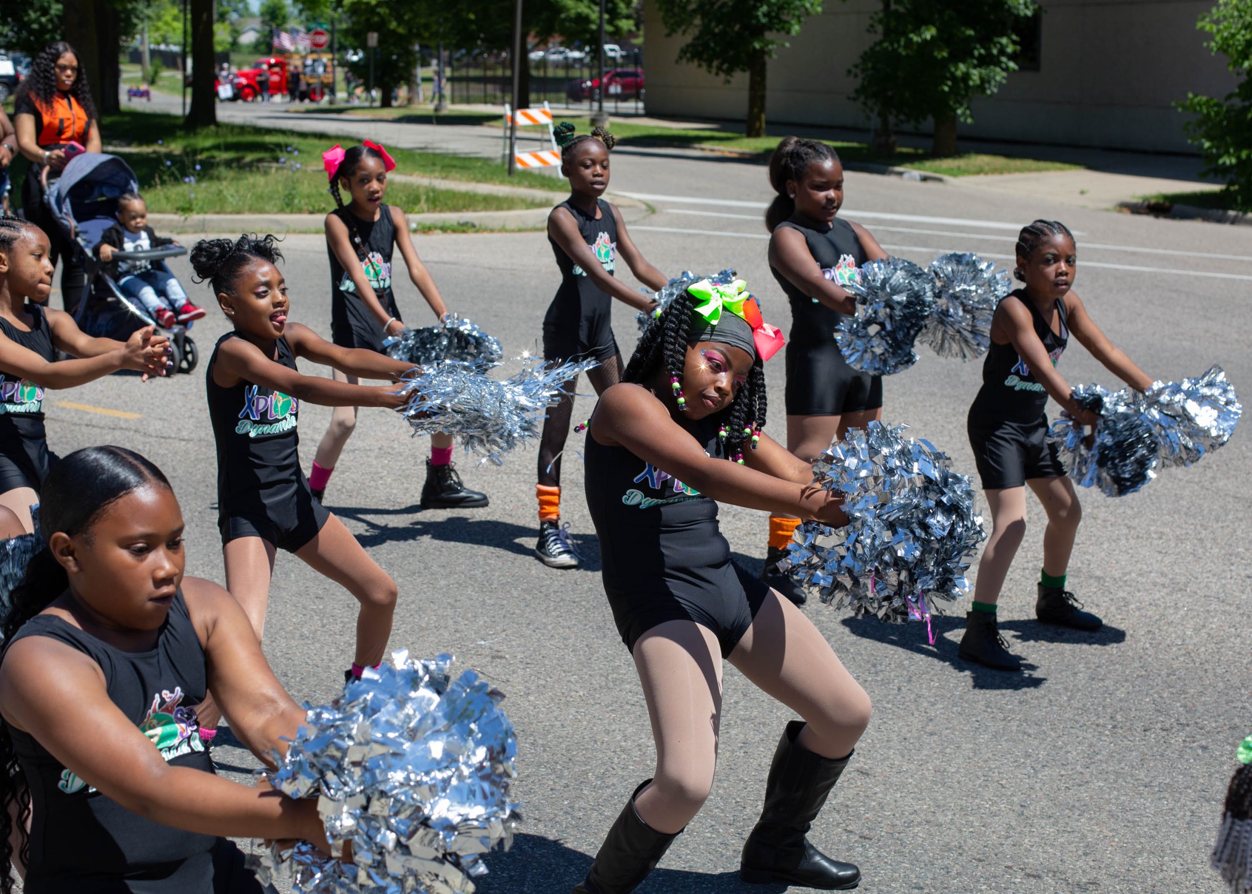 The Kamazing Angels dance team performs a routine during the annual Juneteenth parade in downtown Flint, Mich. on June 18, 2022. (KT Kanazawich