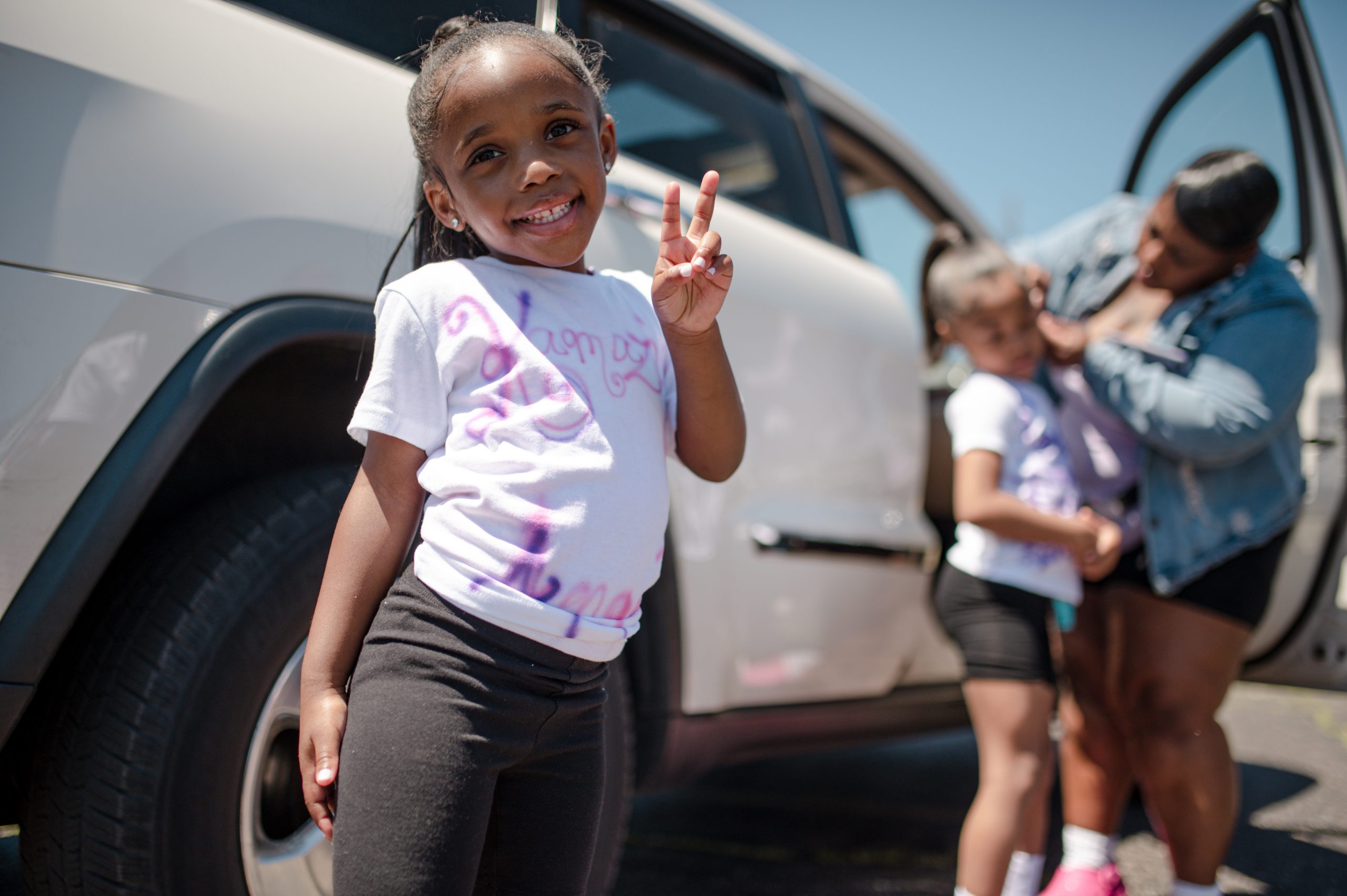A dancer on the Kamazing Angels dance team poses for a portrait while another gets ready ahead of Flint’s Juneteenth Parade in the University of Michigan’s parking lot at the corner of Saginaw Street and Fifth Avenue on Saturday, June 18, 2022. The Kamazing Angels danced in the parade, which ended in the Flat Lot downtown. (Michael Indriolo | Flint Beat)