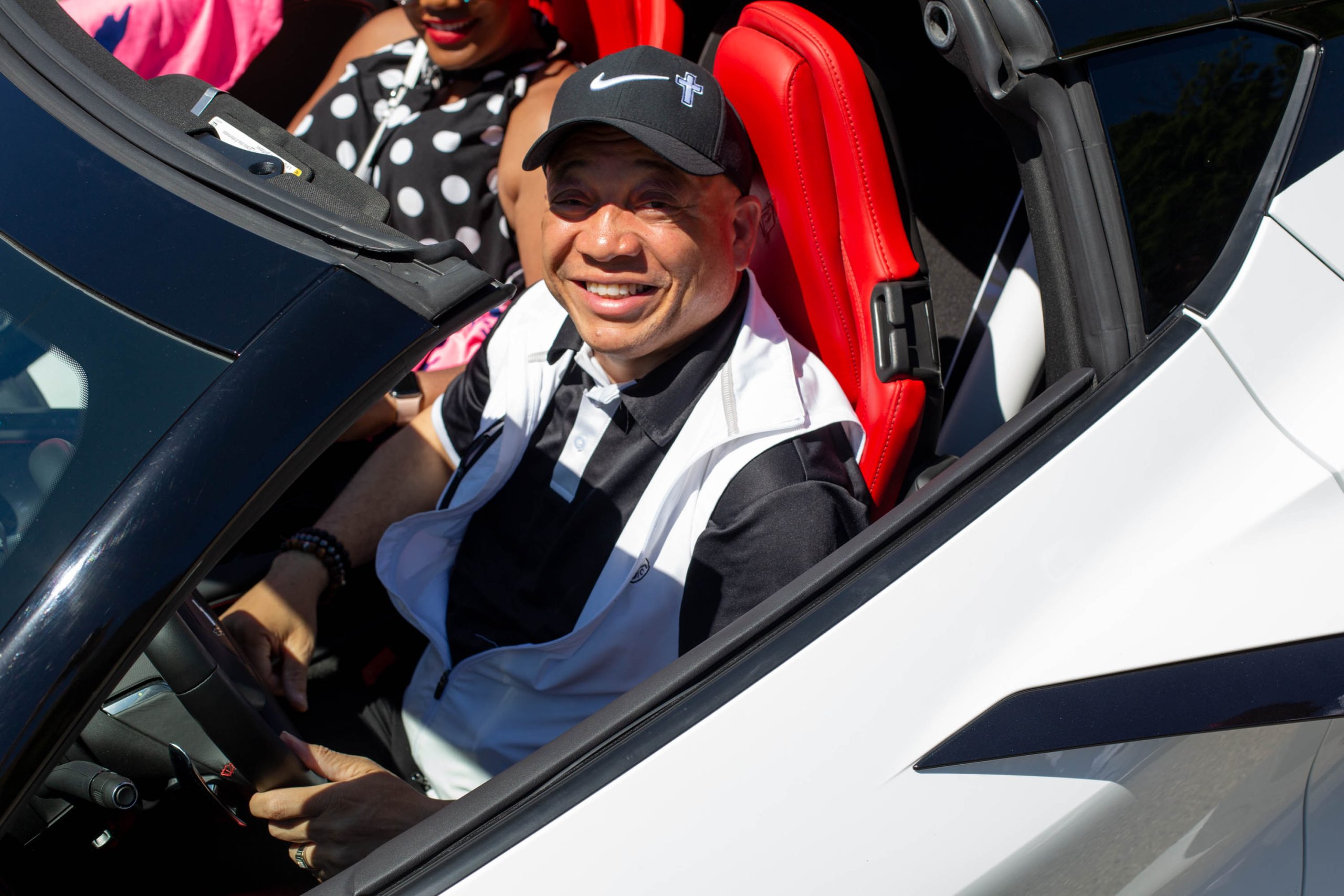 A member of Trendsetters Productions drives a car down Saginaw Street during Flint’s Juneteenth Parade on Saturday, June 18, 2022. This car was specifically for Trendsetters Productions’s This is Me program, which hosts a fashion show for people with special needs. (Michael Indriolo | Flint Beat)
