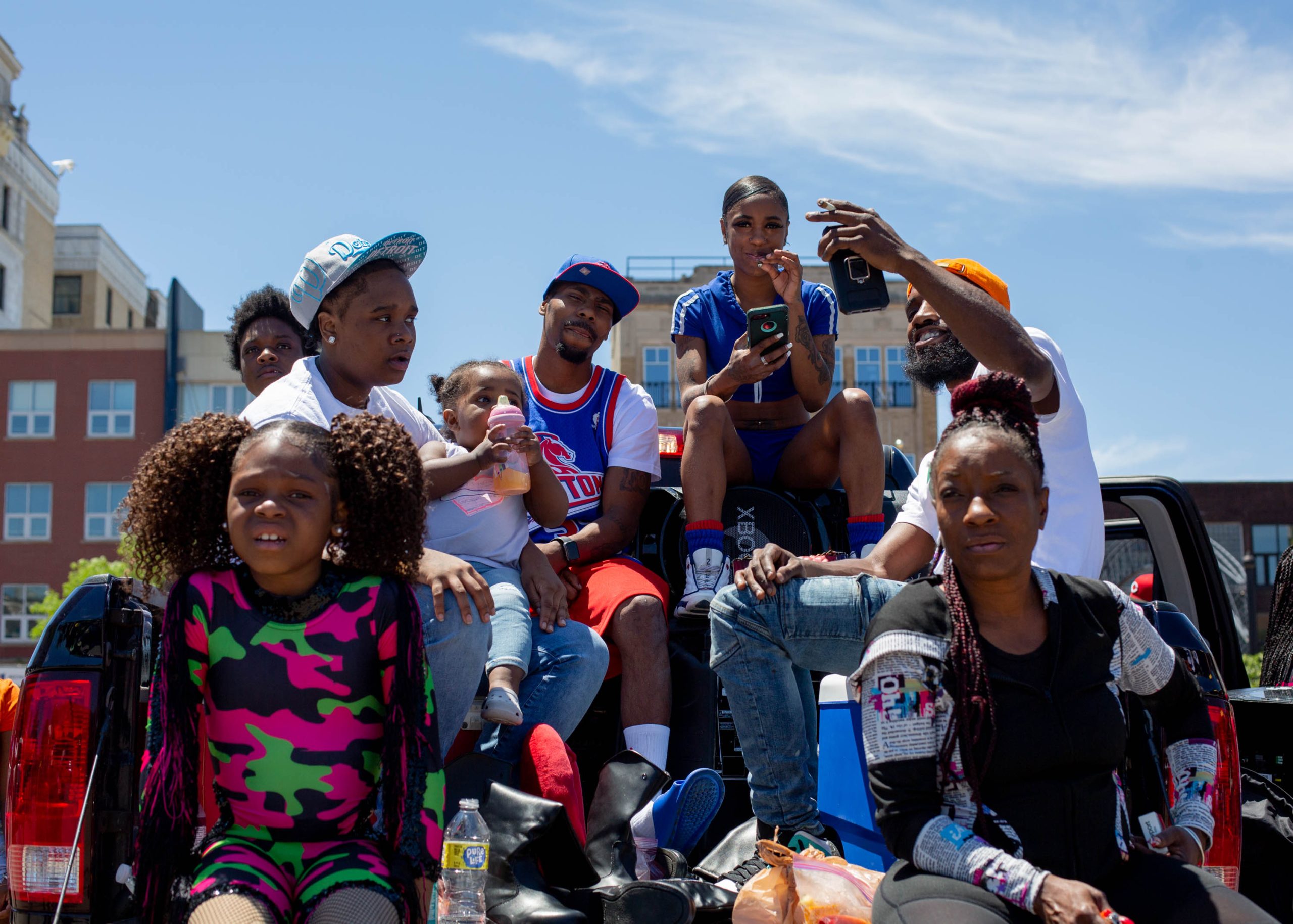 The Kuungana African Drum and Dance Company lead the Juneteenth motorcade from Max Brandon Park to downtown Flint, Mich. on June 19, 2022. (KT Kanazawich | Flint Beat)