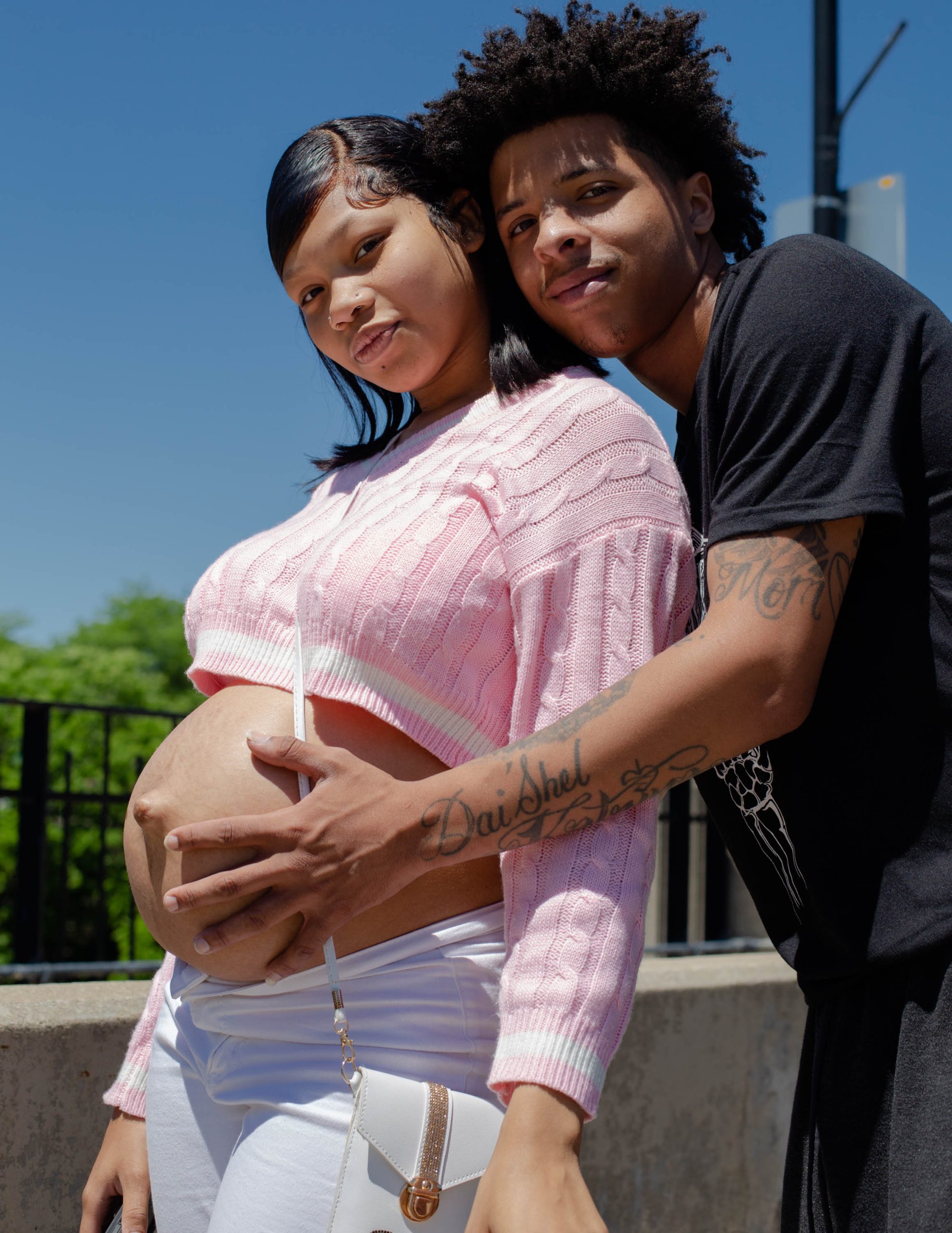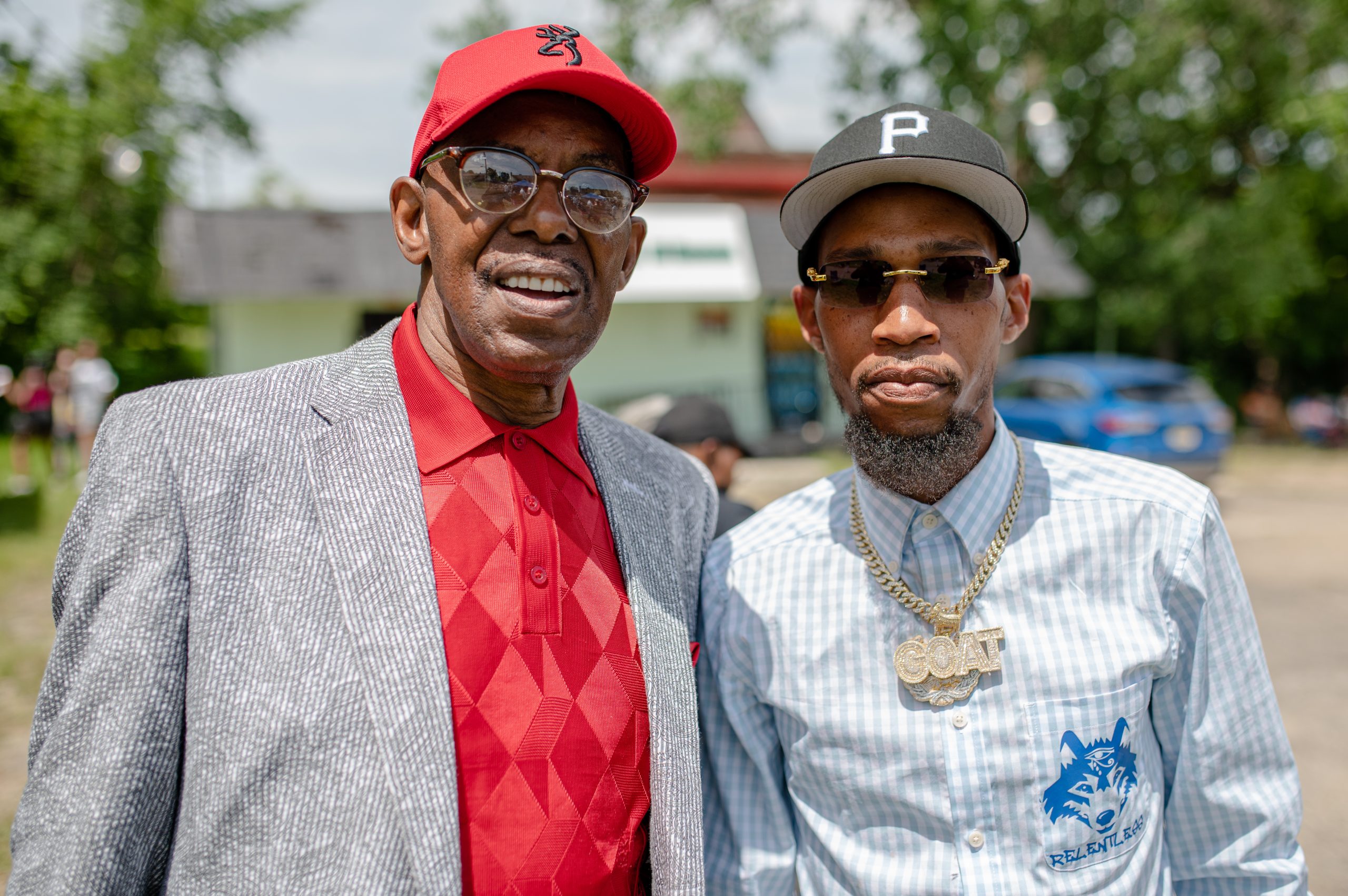 P Nut, a close friend of famed Flint Boxer Claressa Shields, poses for a portrait with Robert McCathern, the pastor of Joy Tabernacle, a nondenominational congregation on Flint’s Northside, at a block party on the street Shields grew up on in Flint’s Northside on Sunday, June 19, 2022. The city changed the name of the street, formerly Spencer Street, to Claressa Shields Street in her honor. Shields worships with McCathern and P Nut at Joy Tabernacle. (Michael Indriolo | Flint Beat)