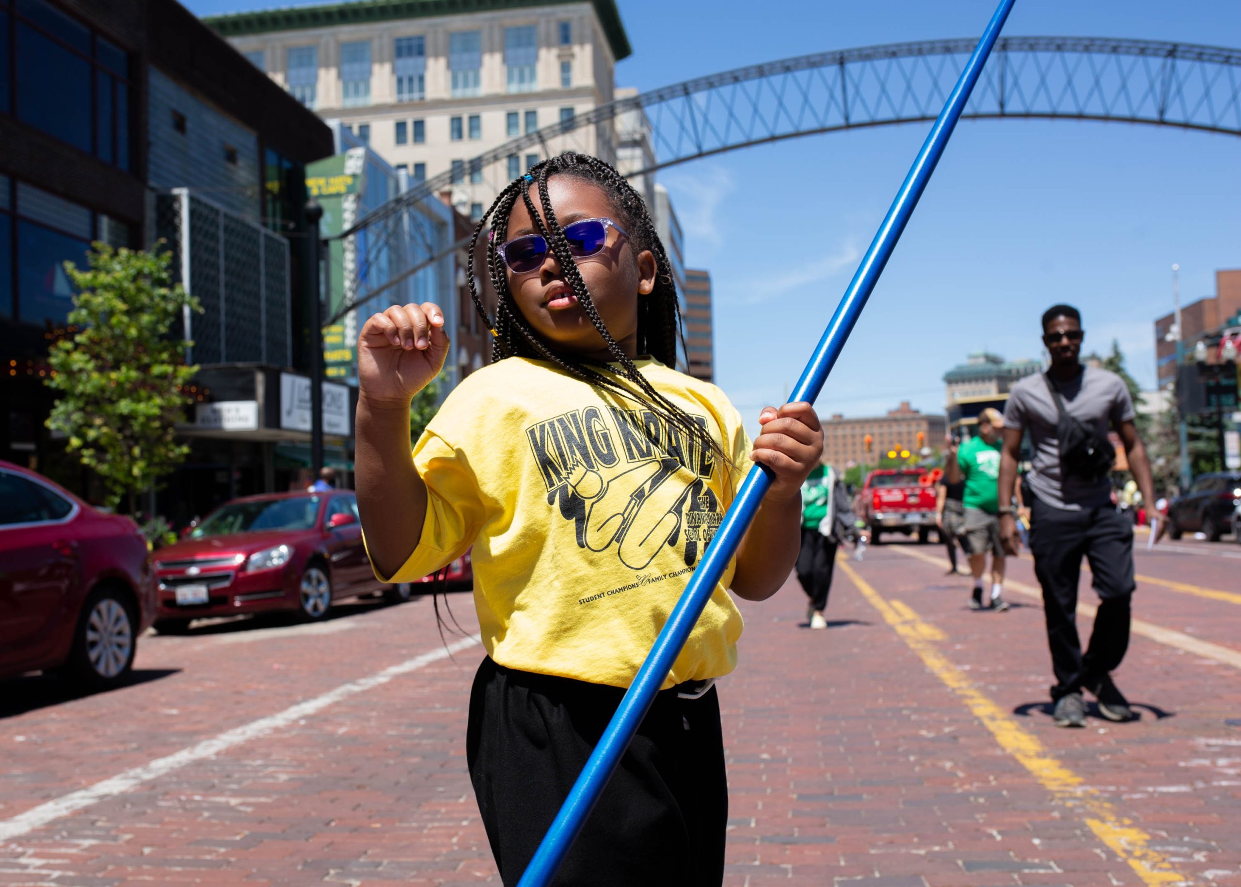 A student from King Karate shows off karate moves in the annual Juneteenth parade in downtown Flint, Mich. on June 18, 2022. (KT Kanazawich | Flint Beat)
