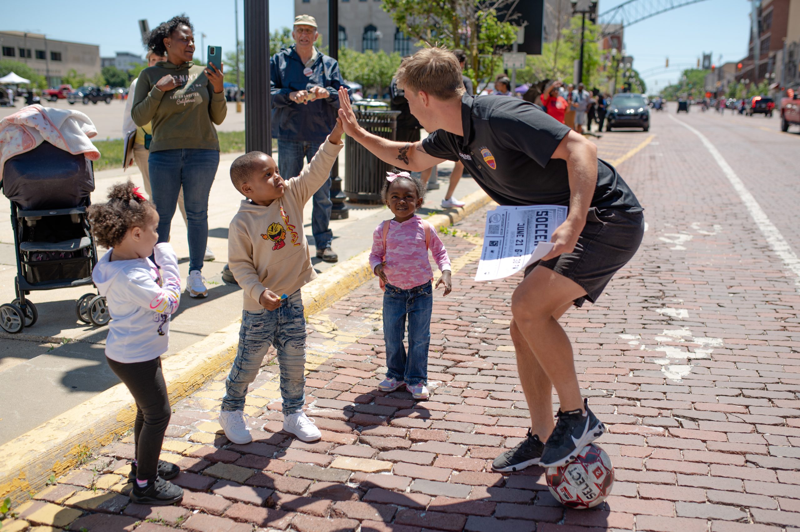 A player on the Flint City Bucks soccer team high fives Elijah Washington after kicking the ball back and forth with him, Ocean Hall and Amaya Walton on Saginaw Street during Flint’s Juneteenth Parade on Saturday, June 18, 2022. (Michael Indriolo | Flint Beat)TK Thomas cheers from the side of a car for Trendsetters Productions as it drives down Saginaw Street during Flint’s Juneteenth Parade on Saturday, June 18, 2022. This car was specifically for Trendsetters Productions’s This is Me program, which hosts a fashion show for people with special needs. (Michael Indriolo | Flint Beat)