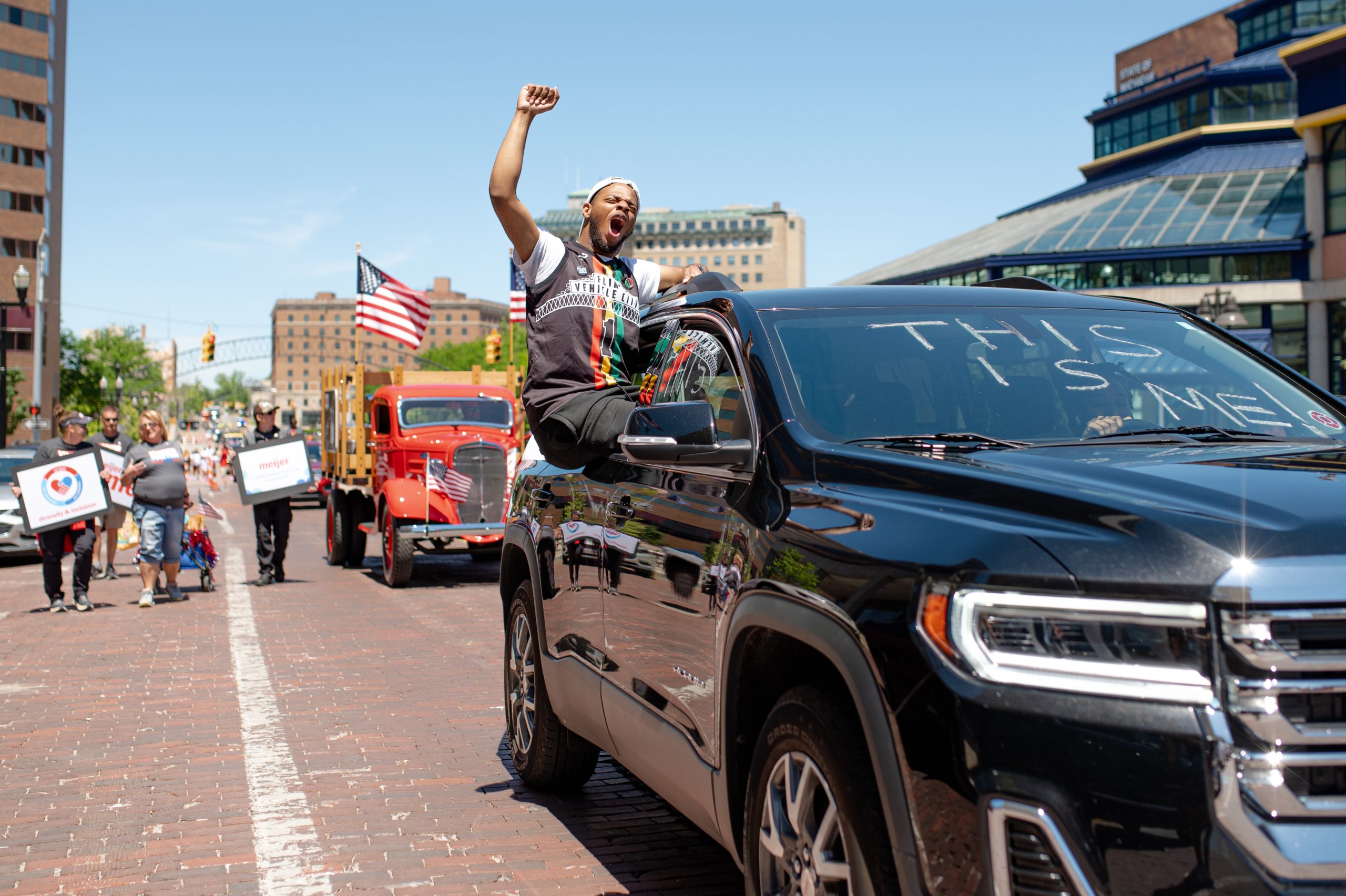 Mayor Sheldon Neeley rides along the annual Juneteenth parade in downtown Flint, Mich. on June 18, 2022. (KT Kanazawich | Flint Beat)