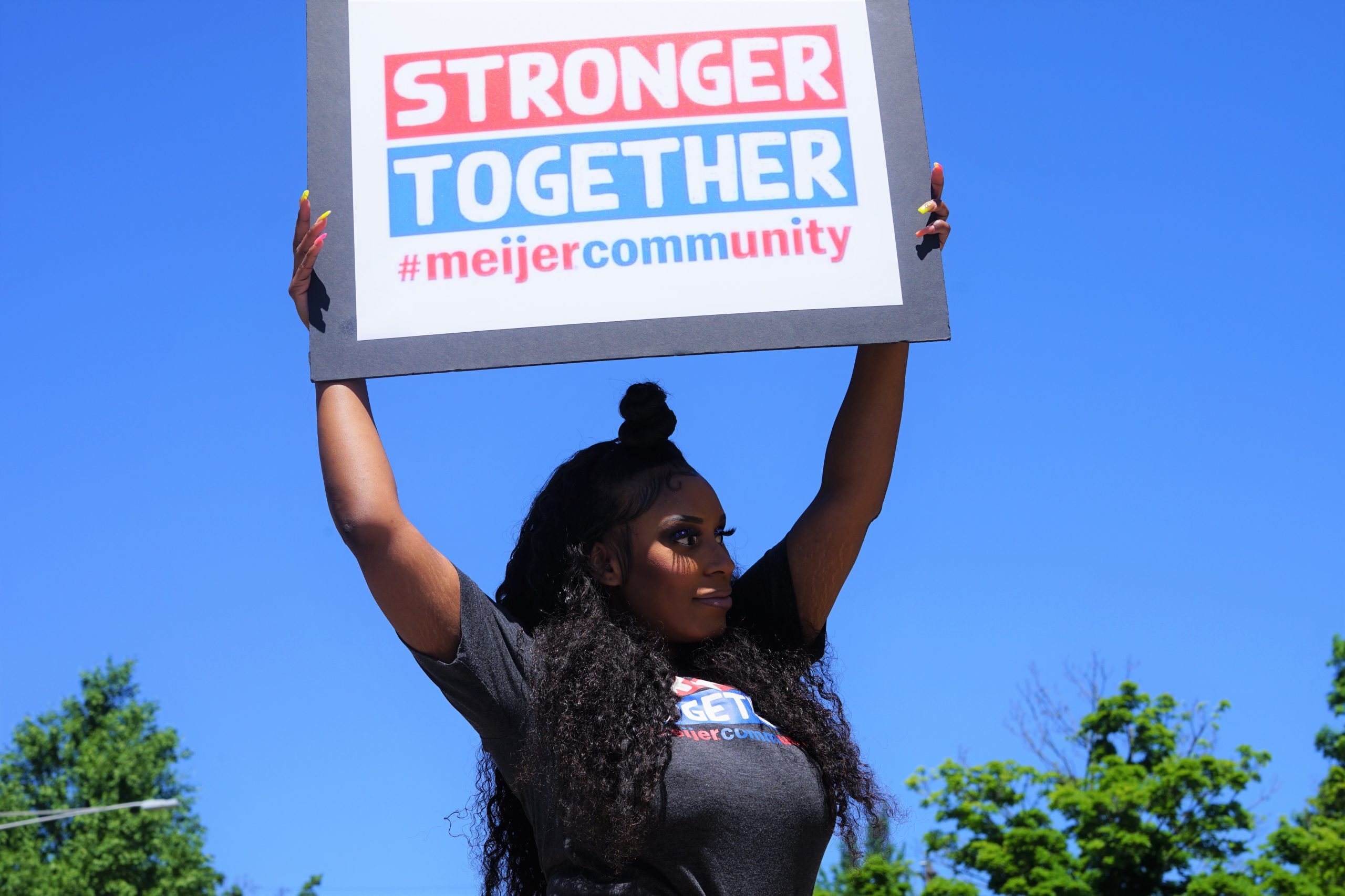 A parade marcher holds up a sign for Meijer grocery store during Flint’s Juneteenth Parade on Saturday, June 18, 2022 (Joshua Johnson | Flint Beat)