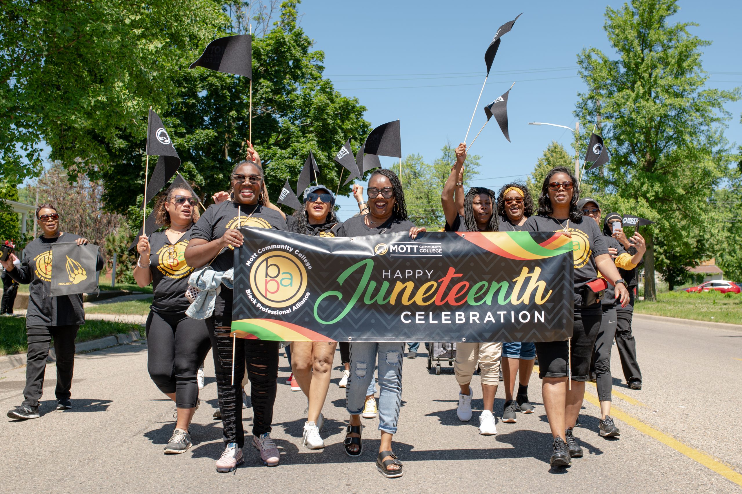 Members of the Mott Community College Black Professional Alliance march down Saginaw Street during Flint’s Juneteenth Parade on Saturday, June 18, 2022. (Michael Indriolo | Flint Beat)