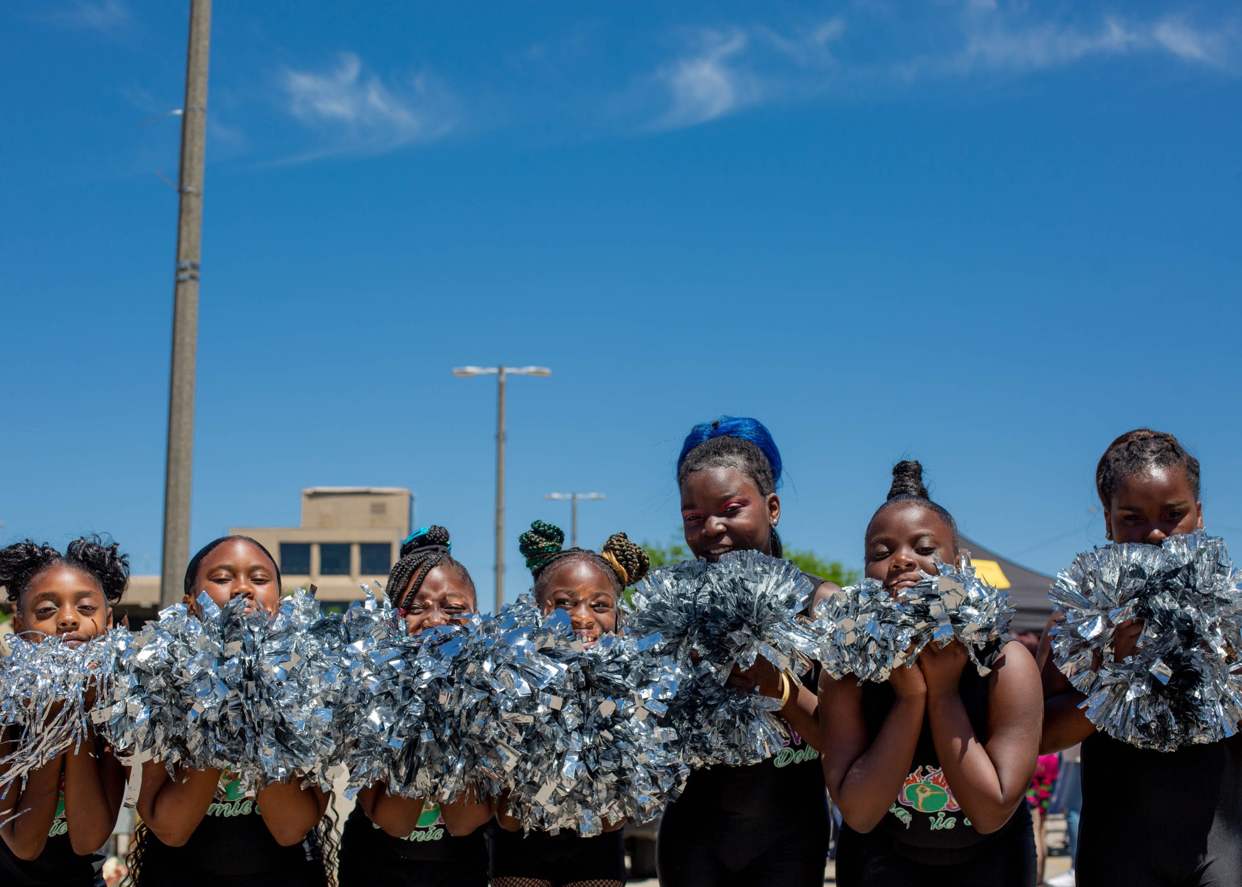 The Xplosive Dynamic Dolls majorette dance group pose with their pom poms after the annual Juneteenth parade in downtown Flint, Mich. on June 18, 2022. (KT Kanazawich | Flint Beat)