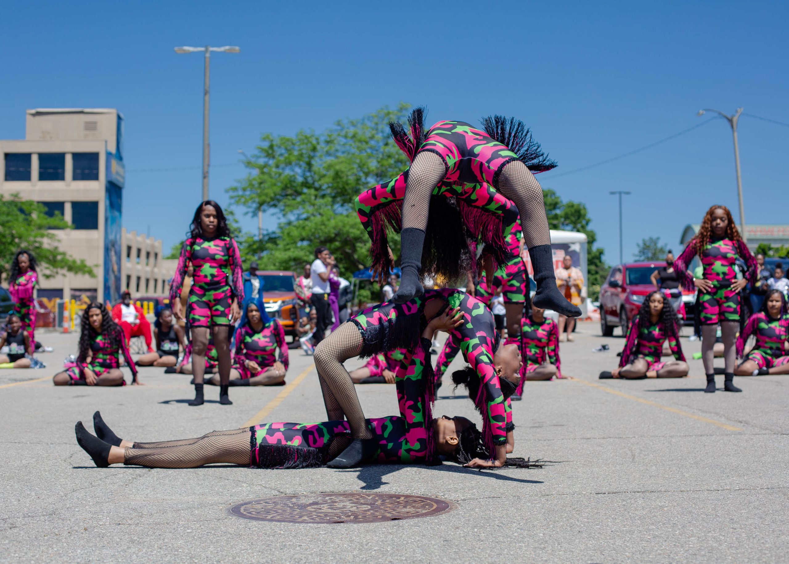 The Xplosive Dynamic Dolls majorette dance group performs in the flat lot after the annual Juneteenth parade in downtown Flint, Mich. on June 18, 2022. (KT Kanazawich | Flint Beat)