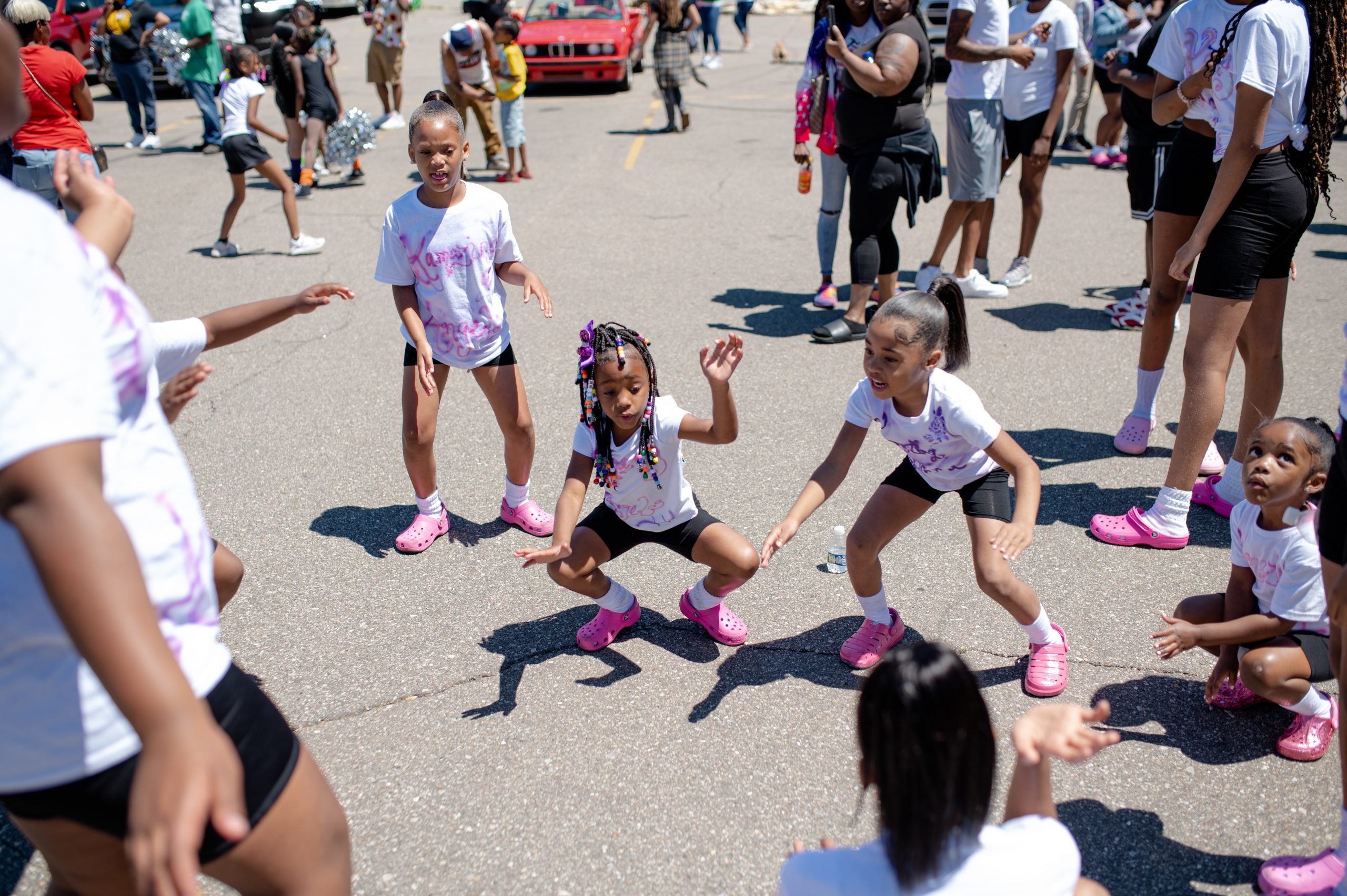 Members of the Kamazing Angels dance team dance in the Downtown Flat Lot after the Flint Juneteenth Parade ended there on Saturday, June 18, 2022. (Michael Indriolo | Flint Beat)