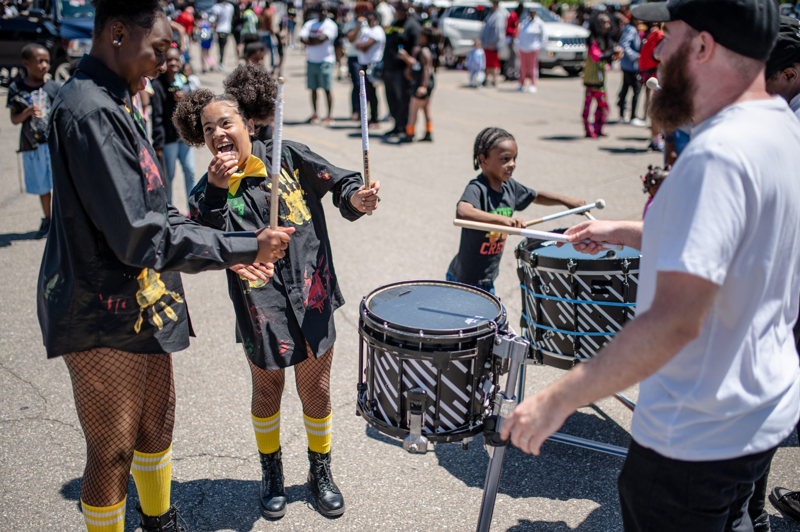 Notorious Monroe dance team members play a drum with Juneteenth Drumline member Jonathan Elkins while Mishaun Coffer plays another one with Antonio King in the Downtown Flat Lot after the Flint Juneteenth Parade ended there on Saturday, June 18, 2022. (Michael Indriolo | Flint Beat)