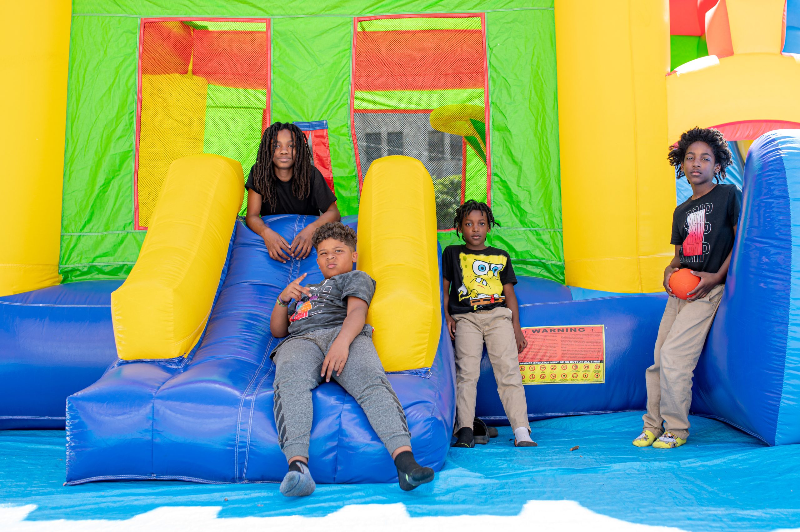 Children play on a bouncy castle during the Black Buckham Juneteenth Festival hosted by Comma Bookstore & Social Hub in Flint’s Buckham Alley on Saturday, June 18, 2022. (Michael Indriolo | Flint Beat)