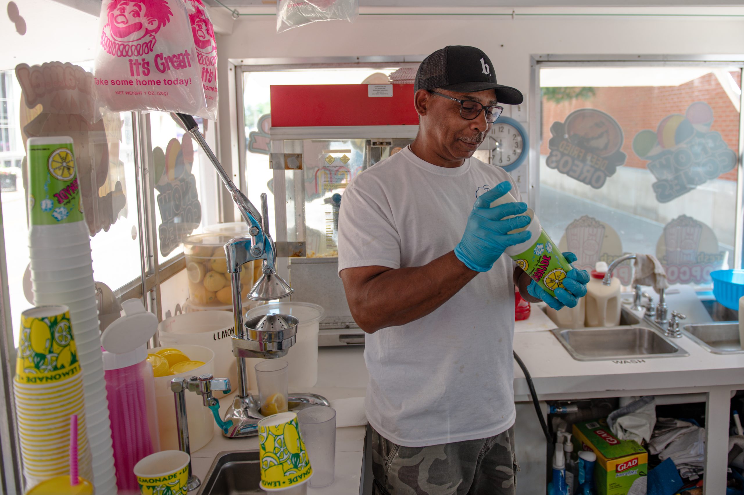Sugar Shack owner TJ Black shakes up a lemonade in his concession truck during the Black Buckham Juneteenth Festival hosted by Comma Bookstore & Social Hub in Flint’s Buckham Alley on Saturday, June 18, 2022. Black’s family bought the Sugar Shack truck about five years ago, and started operating in 2019. With so many events cancelled by the pandemic for the last two years, operating the truck was difficult, he said. Now that more events are opening up, the Sugar Shack is busy this summer, he said. (Michael Indriolo | Flint Beat)