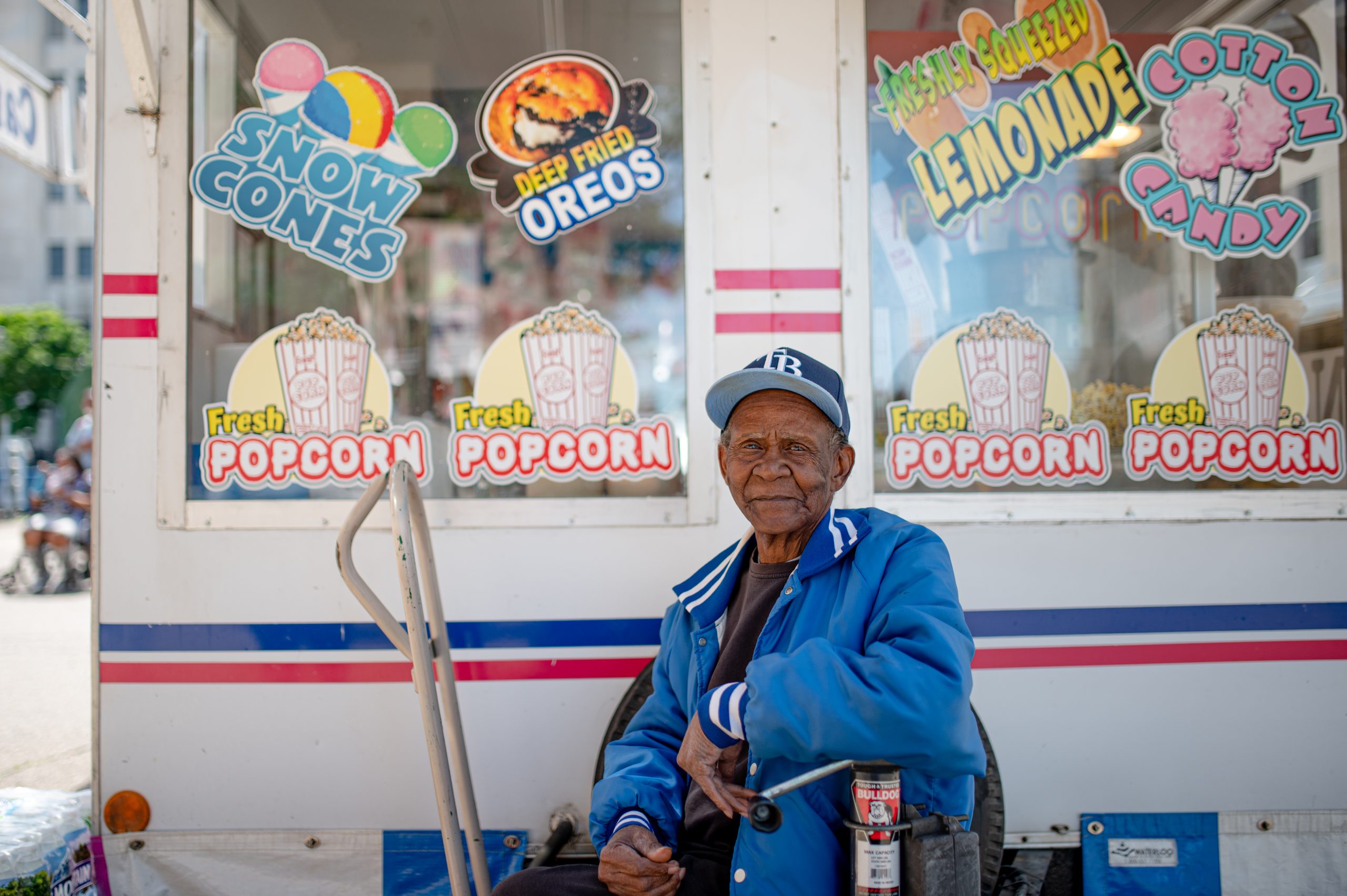 Thomas Black poses for a portrait outside his family’s concession truck during the Black Buckham Juneenth Festival hosted by Comma Bookstore & Social Hub in Flint’s Buckham Alley on Saturday, June 18, 2022. Black’s family bought the Sugar Shack truck about five years ago, and started operating in 2019. With so many events cancelled by the pandemic for the last two years, operating the truck was difficult, said TJ Black, Thomas Black’s son. Thomas Black spent the Juneteenth Festival hanging out and people watching from his spot on the truck’s trailer hitch. (Michael Indriolo | Flint Beat)
