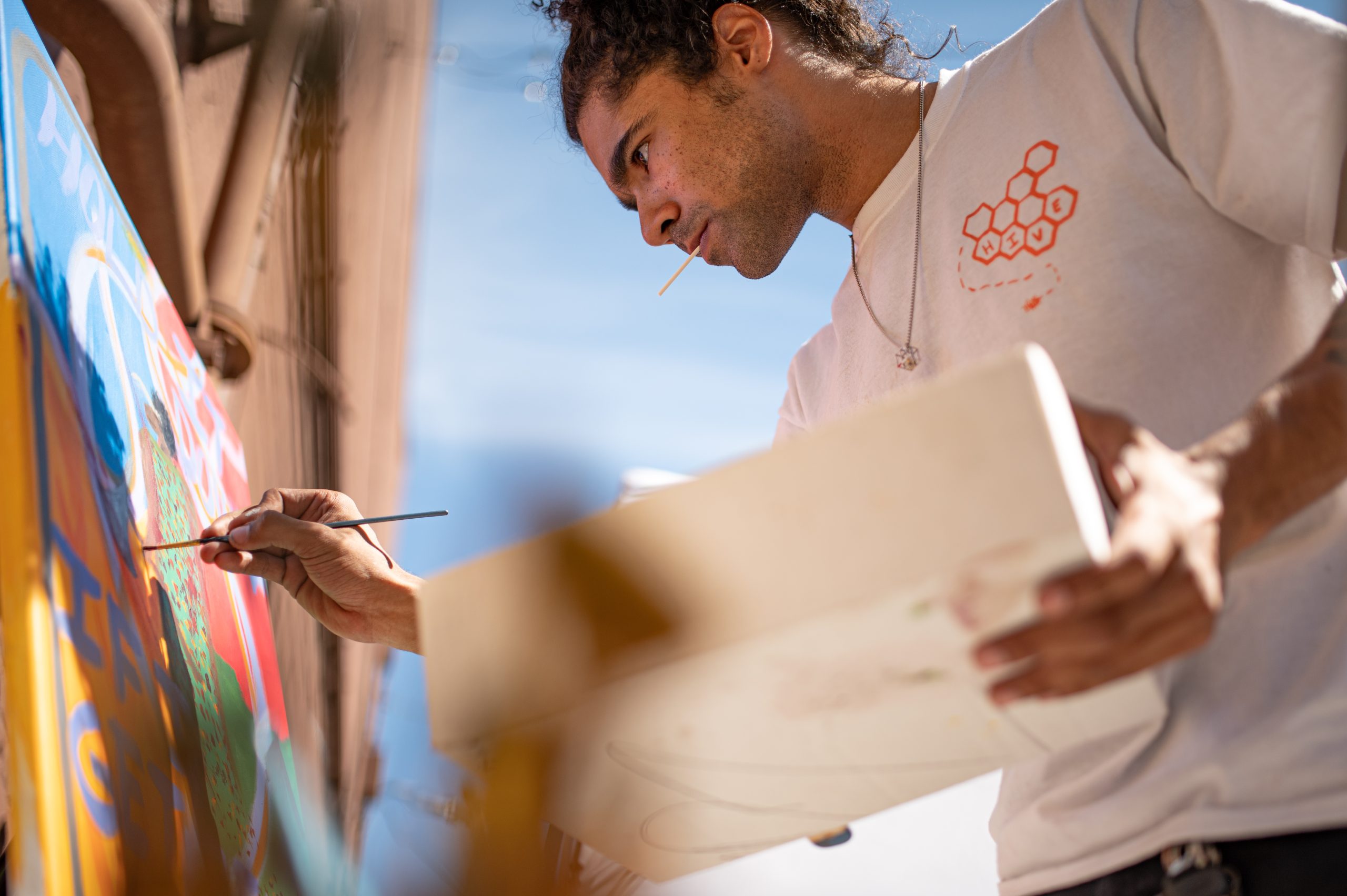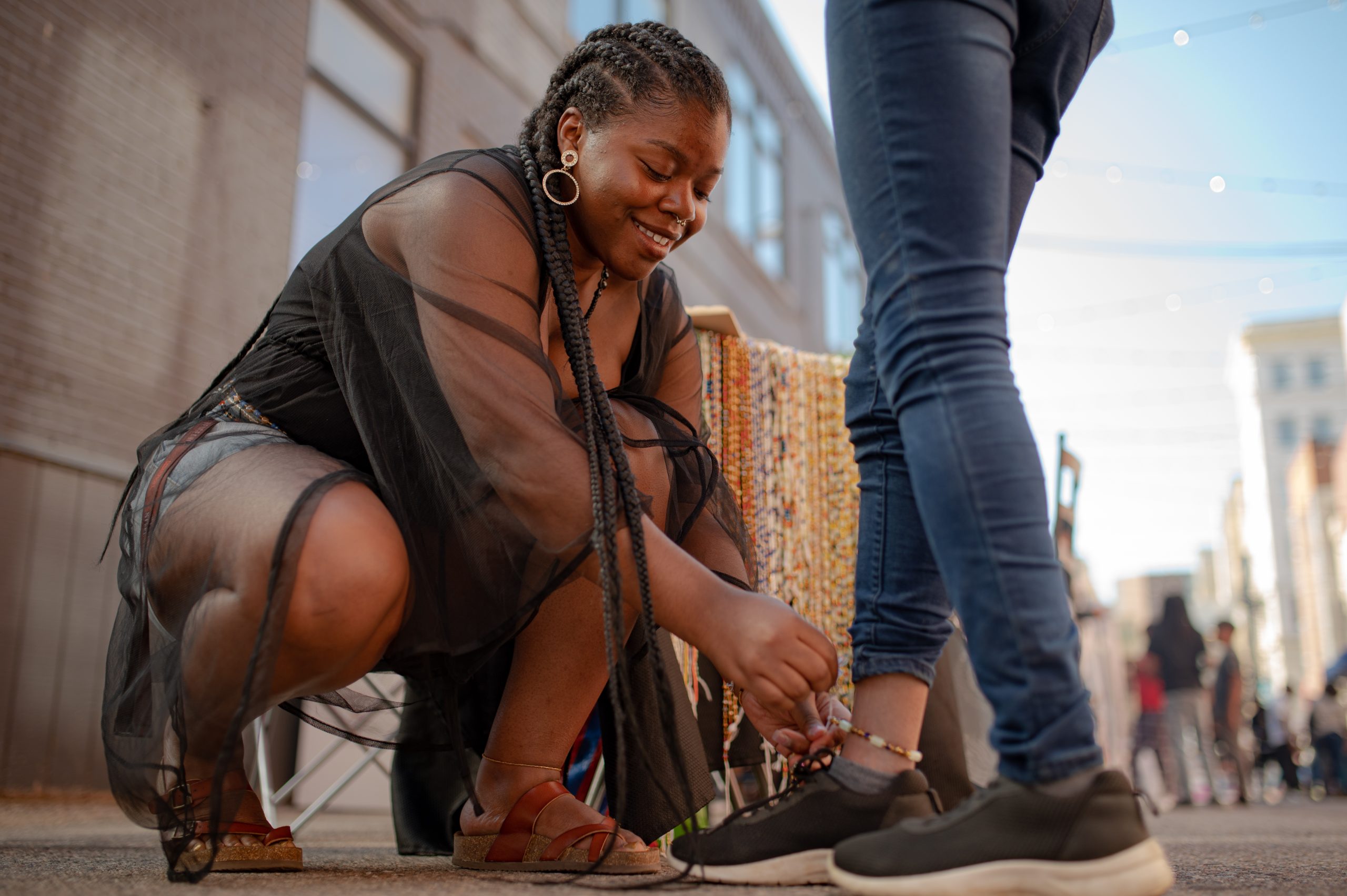 Artist Bee Robertson paints during the Black Buckham Juneteenth Festival hosted by Comma Bookstore & Social Hub in Flint’s Buckham Alley on Saturday, June 18, 2022. Robertson has been drawing and painting for years, and he just hosted his first gallery show at Flint Local 432 in May. (Michael Indriolo | Flint Beat)Deszy Marie, founder of the waistbead business Destiny’s Blessings, ties an anklet on Kirei Turner during the Black Buckham Juneteenth Festival hosted by Comma Bookstore & Social Hub in Flint’s Buckham Alley on Saturday, June 18, 2022. (Michael Indriolo | Flint Beat)
