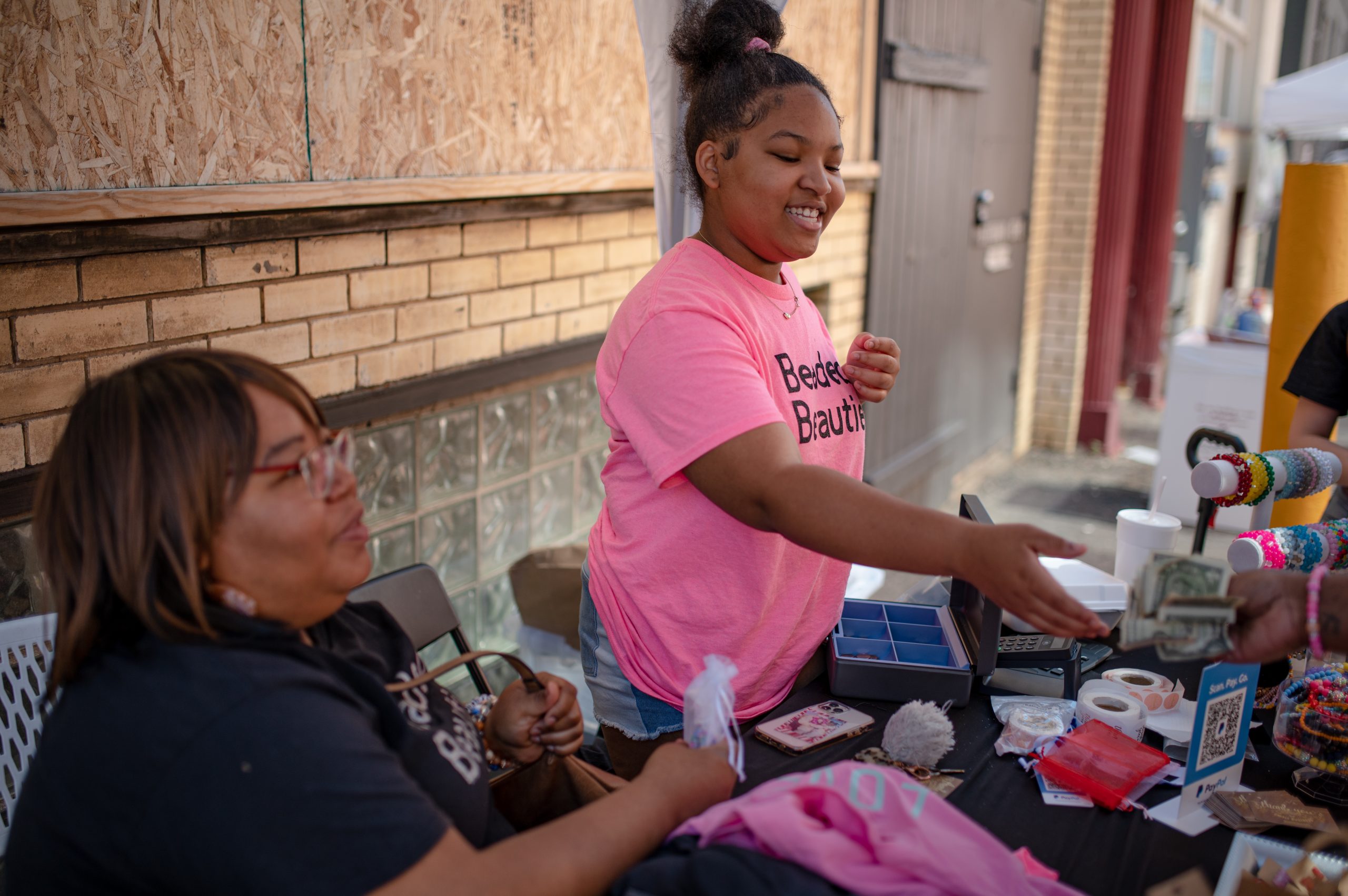 Aaliyah Gates and her mother Sandra Peoples, who together started the handcrafted bracelet business called Beadedd Beautiess, sell bracelets at their table during the Black Buckham Juneteenth Festival hosted by Comma Bookstore & Social Hub in Flint’s Buckham Alley on Saturday, June 18, 2022. (Michael Indriolo | Flint Beat)