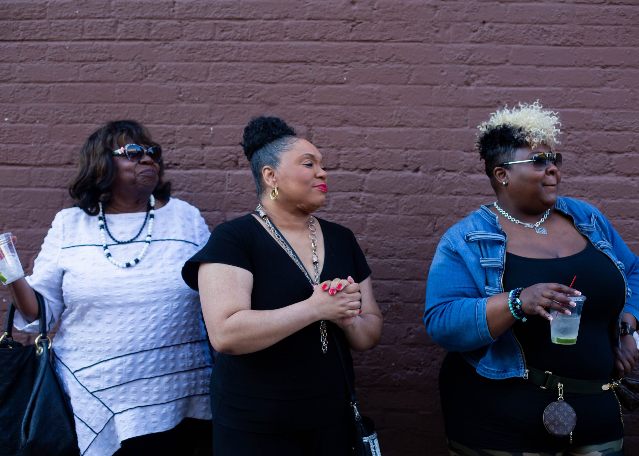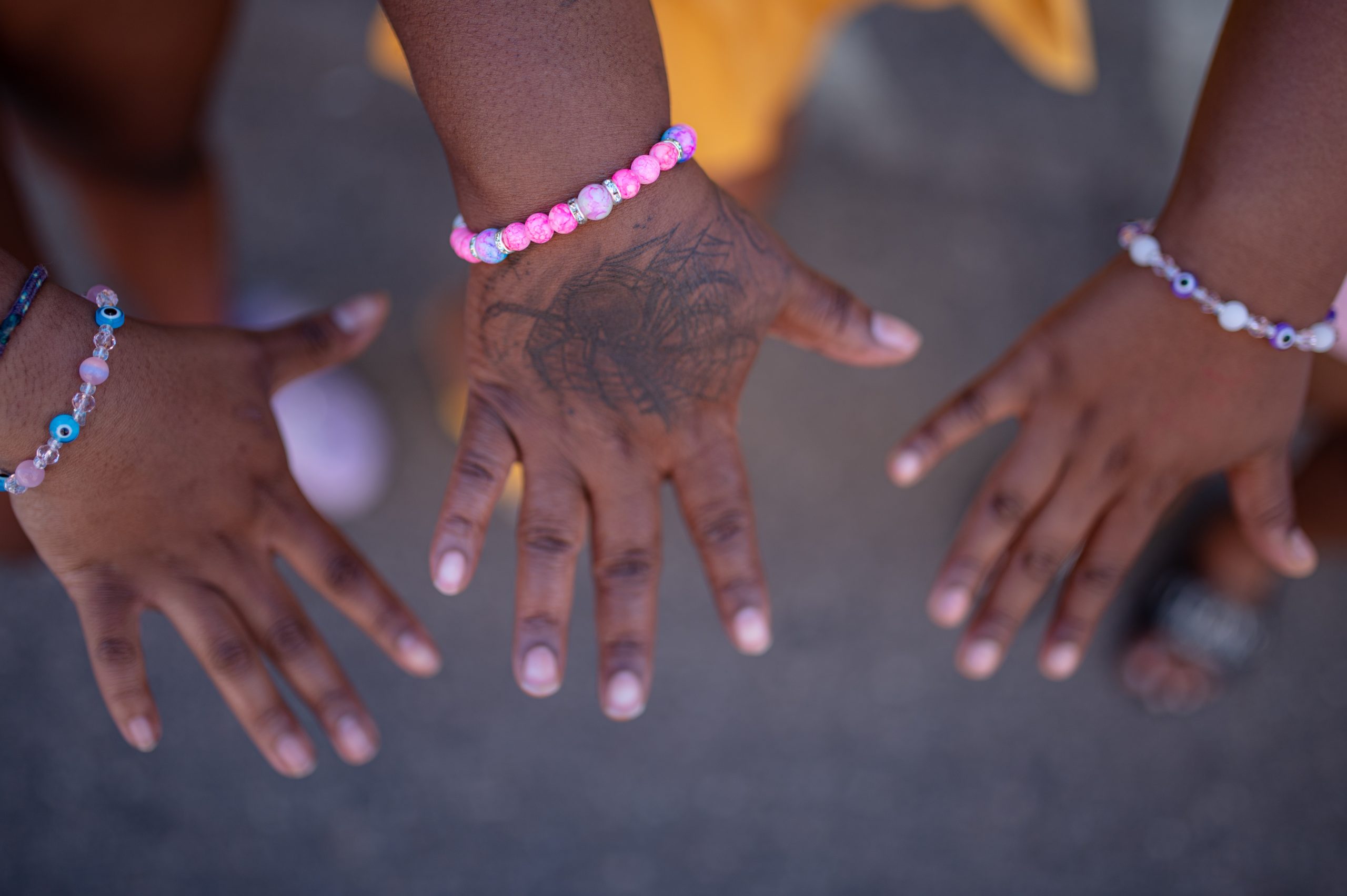 Sylivia Tripplett, Anaiya Sweeney and Tamera Harris show off the bracelets they just bought from Beadedd Beautiess, a handcrafted bracelet business started by Aaliyah Gates and her mother Sandra Peoples, during the Black Buckham Juneteenth Festival hosted by Comma Bookstore & Social Hub in Flint’s Buckham Alley on Saturday, June 18, 2022. (Michael Indriolo | Flint Beat)