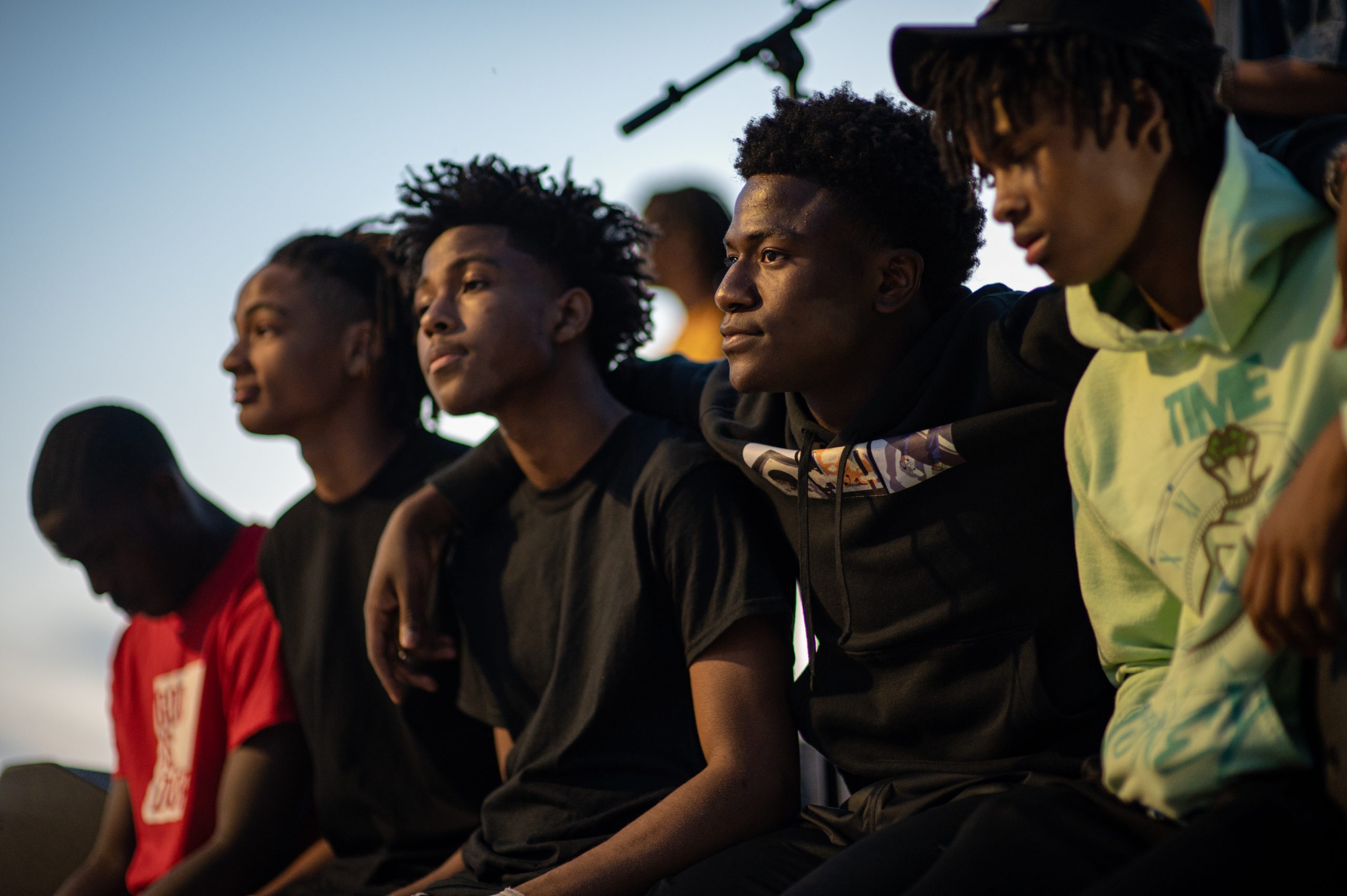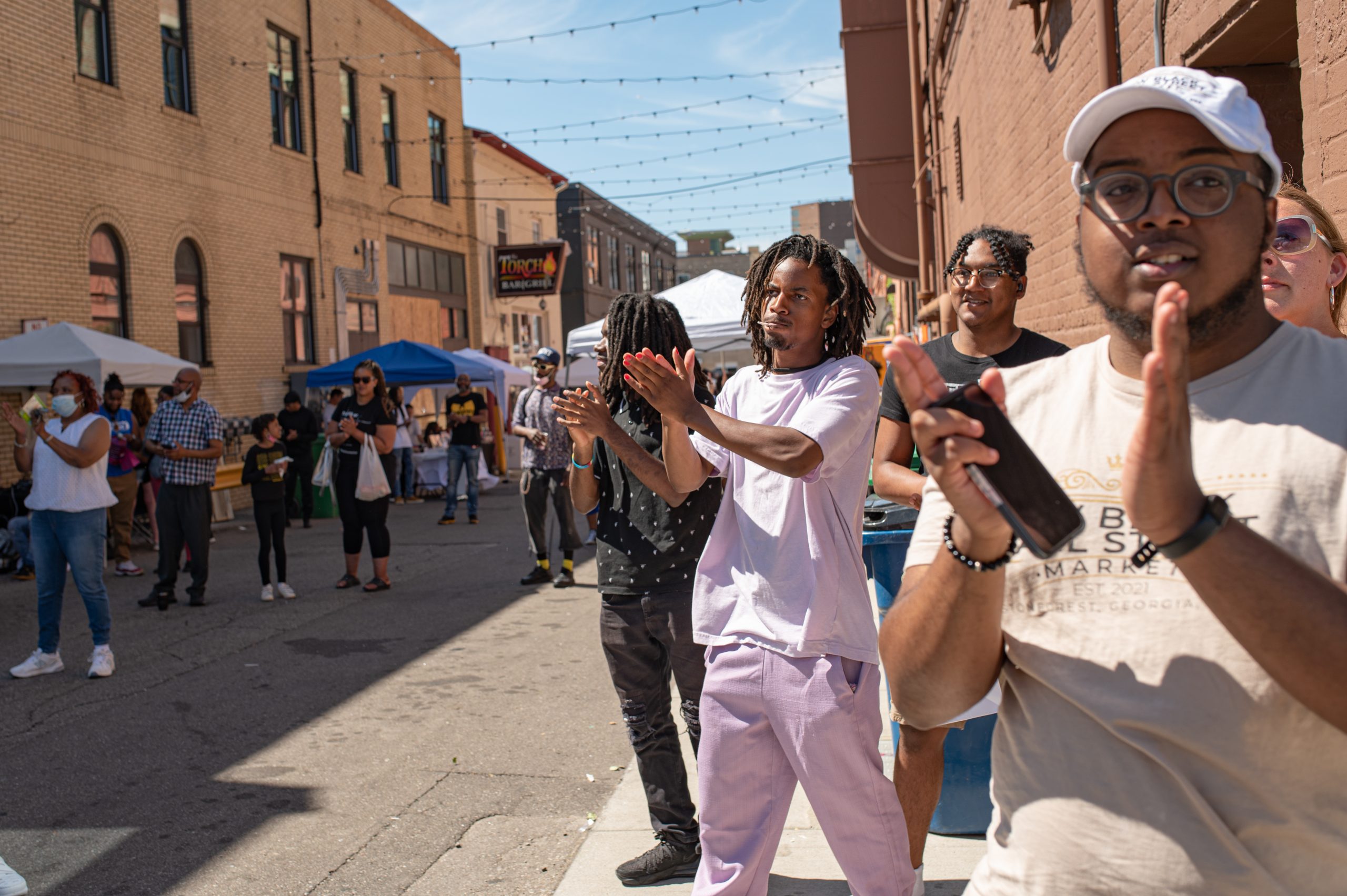 Jahiem Upchurch, Devontae Williams and Antonio Sweeney clap after King Kam performed a spoken word poem during the Black Buckham Juneteenth Festival hosted by Comma Bookstore & Social Hub in Flint’s Buckham Alley on Saturday, June 18, 2022. (Michael Indriolo | Flint Beat)
