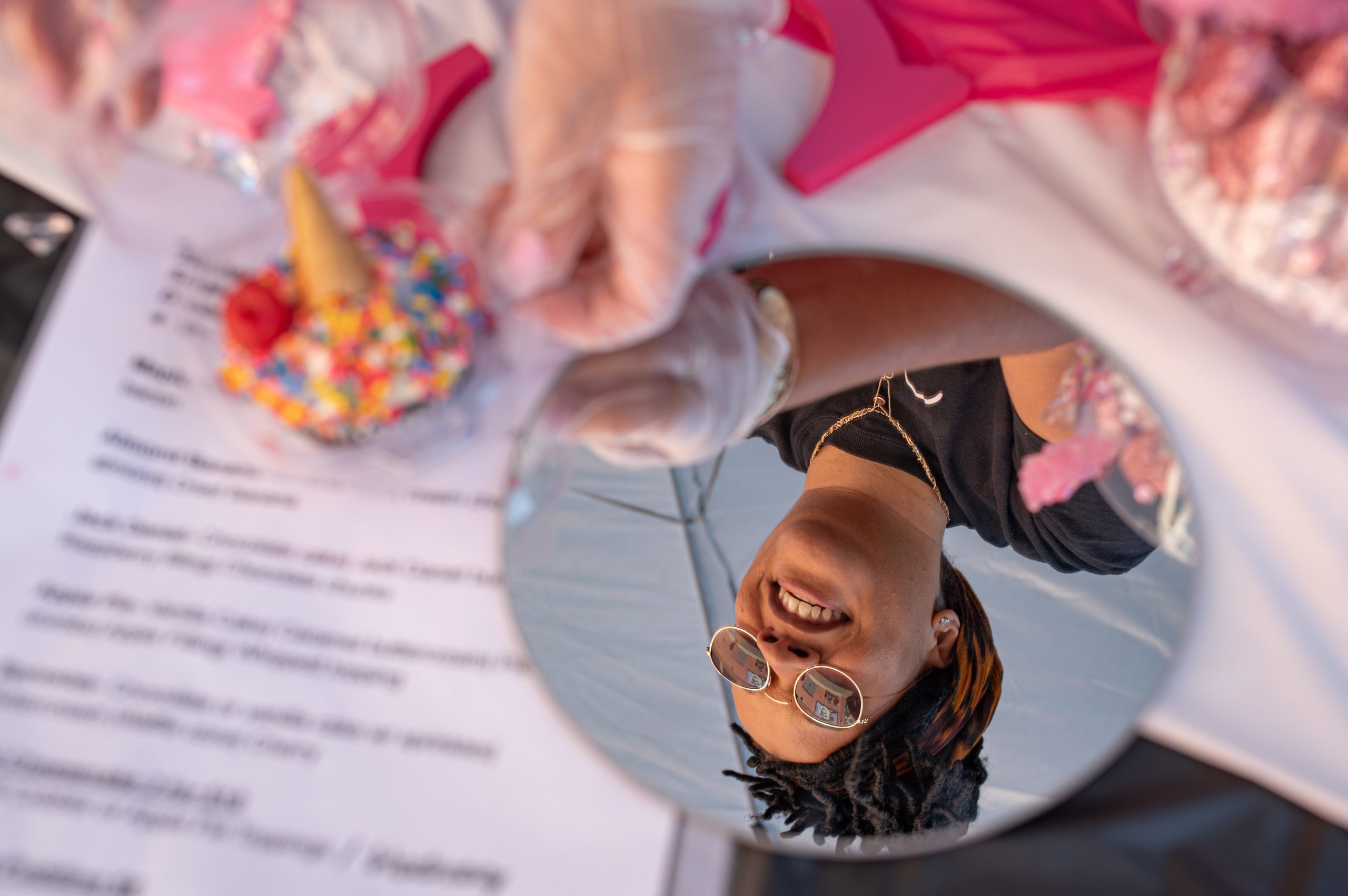 Jaszmane Sisco, founder of the pastry arts brand Little Suga’s, arranges a cupcake she made on her table at the Black Buckham Juneteenth Festival hosted by Comma Bookstore & Social Hub in Flint’s Buckham Alley on Saturday, June 18, 2022. (Michael Indriolo | Flint Beat)
