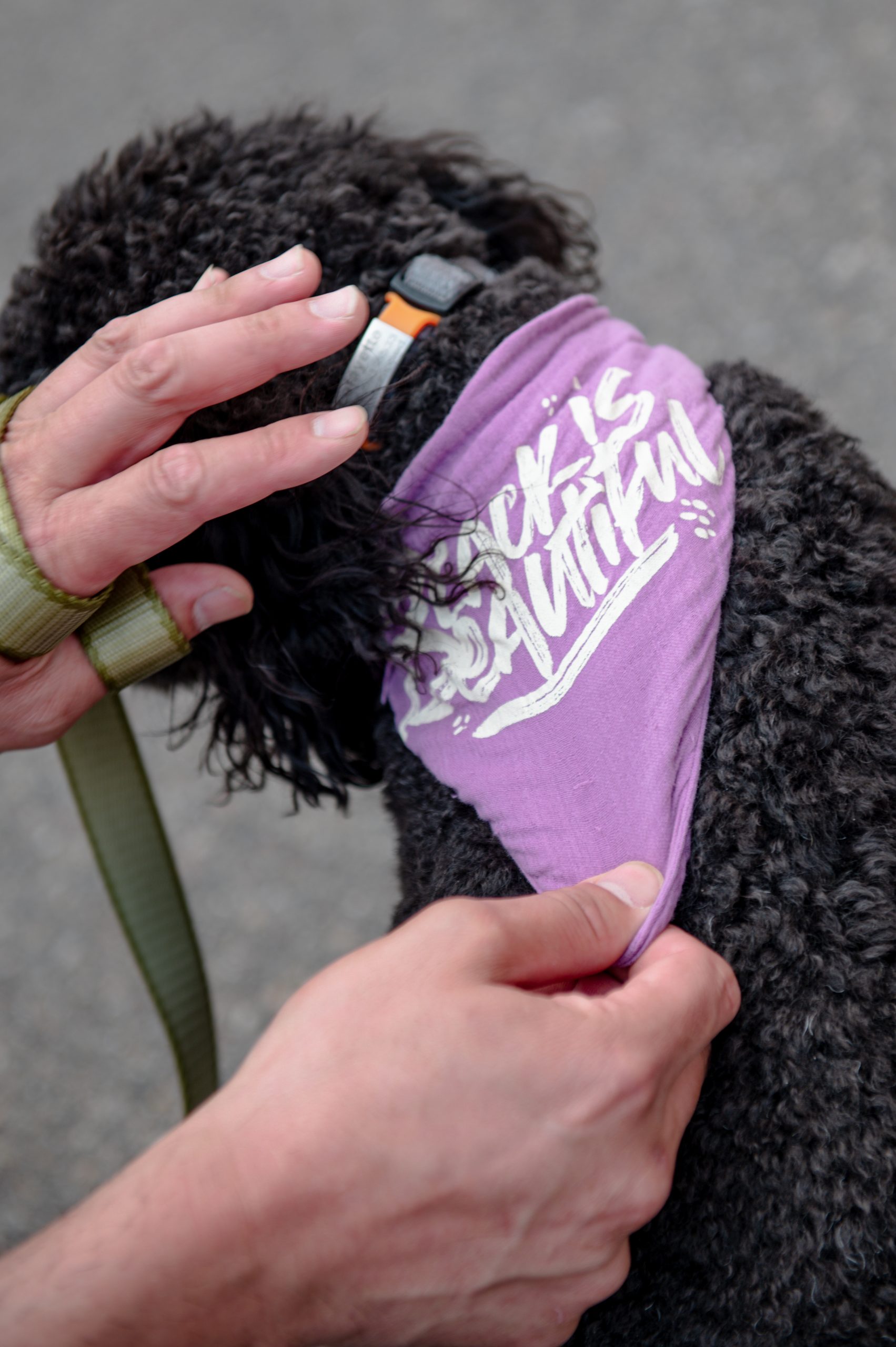 Flint City Social Club founder Tony Vu shows a bandana on his dog Lafa that reads “Black is Beautiful” during the Black Buckham Juneteenth Festival hosted by Comma Bookstore & Social Hub in Flint’s Buckham Alley on Saturday, June 18, 2022. (Michael Indriolo | Flint Beat)