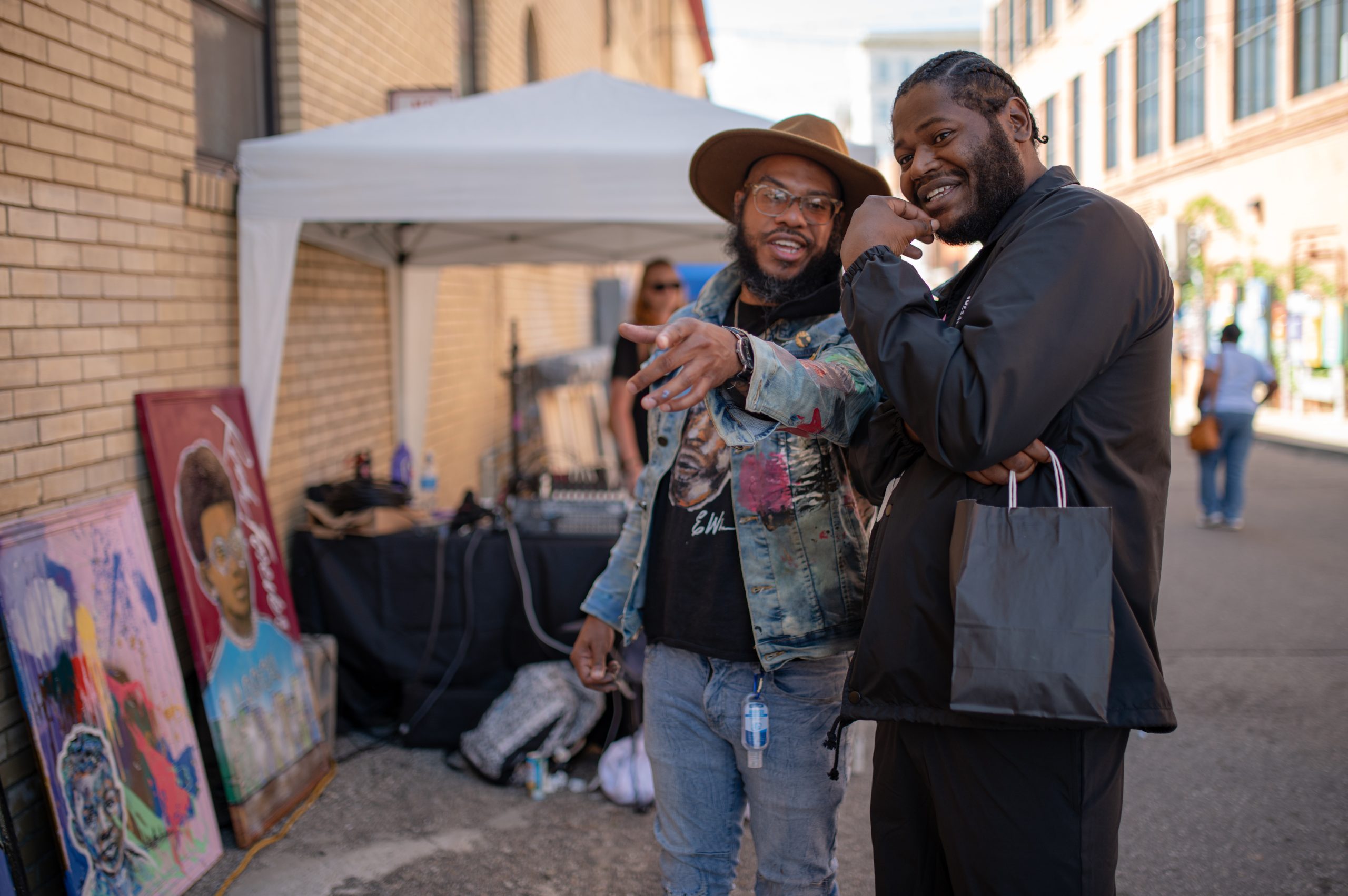 Flint artist Errin Whitaker talks about his piece “Fat Daddy,” a drawing of Notorius B.I.G., with Julian Collins, who bought it during the Black Buckham Juneteenth Festival hosted by Comma Bookstore & Social Hub in Flint’s Buckham Alley on Saturday, June 18, 2022. (Michael Indriolo | Flint Beat)