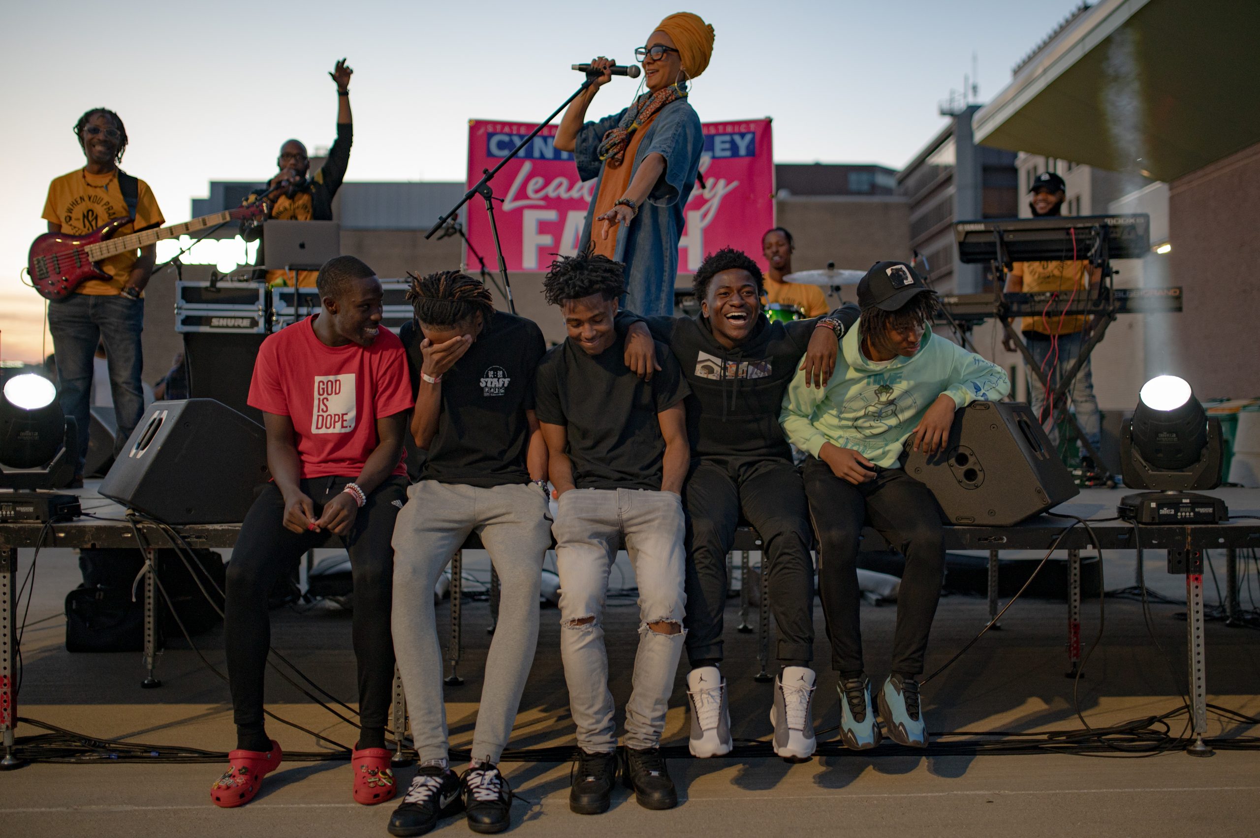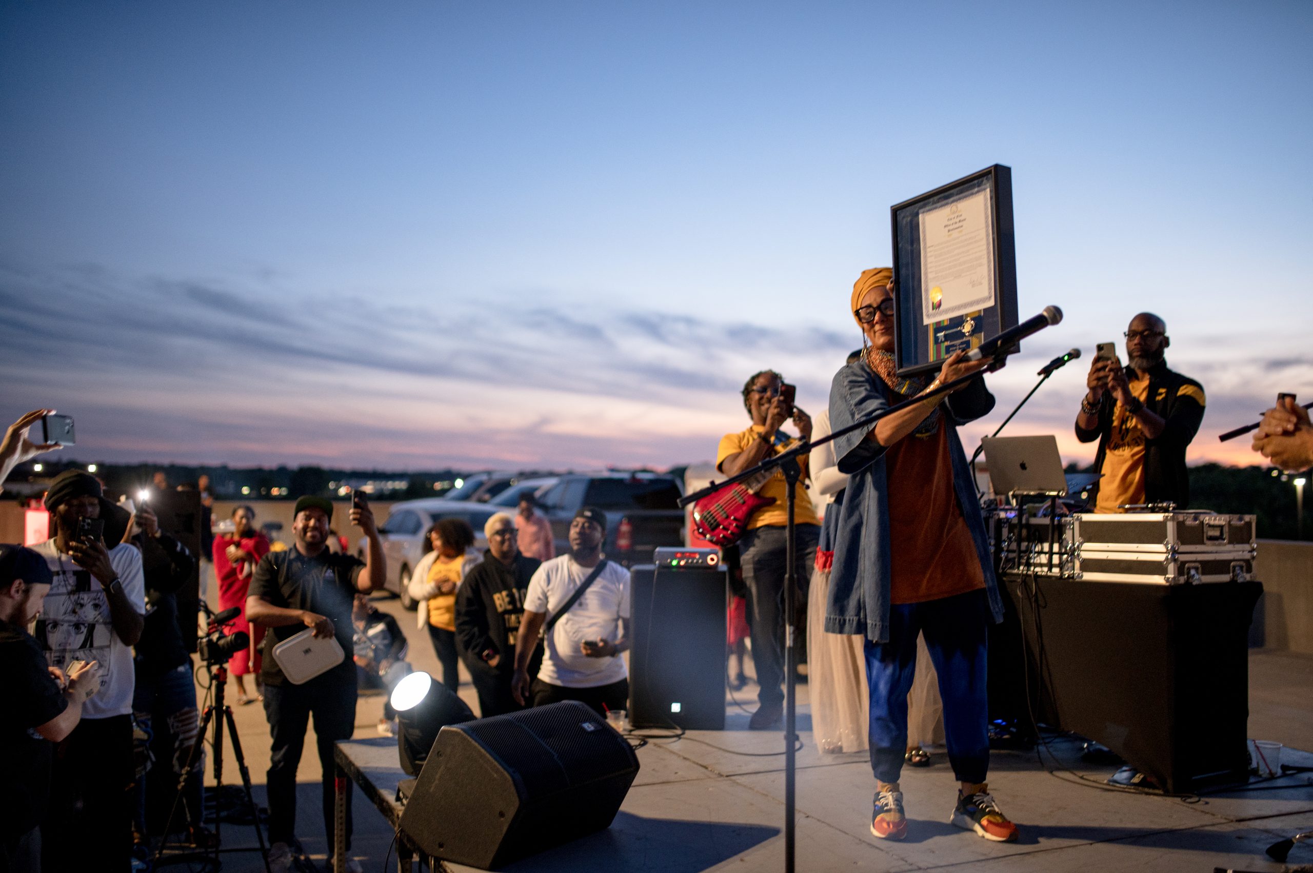 Flint musician Mama Sol performs on top of the James W. Rutherford Parking Structure in Downtown Flint on Saturday, June 18, 2022. (Michael Indriolo | Flint Beat)Flint musician Mama Sol speaks about the importance of caring for the youth after calling up her son Wasir James and his friends Kevin Tiggs Jr., Damarcus Burke Jr., Shawk Holbrook and Isaiah Smith during her performance on top of the James W. Rutherford Parking Structure in Downtown Flint on Saturday, June 18, 2022. (Michael Indriolo | Flint Beat)Flint Musician Mama Sol raises up her key to the city that Mayor Sheldon Neeley presented to her during her performance on top of the James W. Rutherford Parking Structure in Downtown Flint on Saturday, June 18, 2022. (Michael Indriolo | Flint Beat)