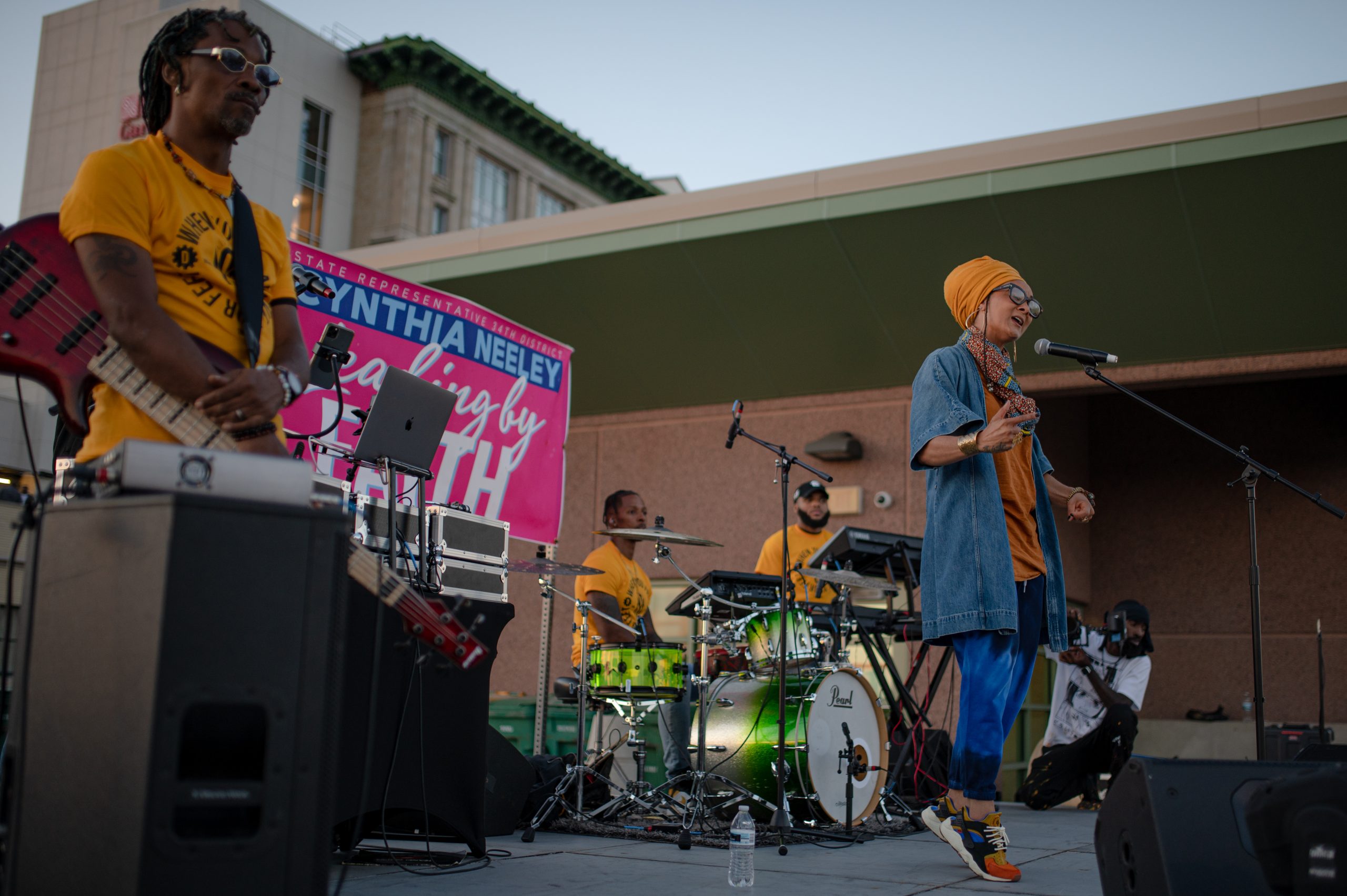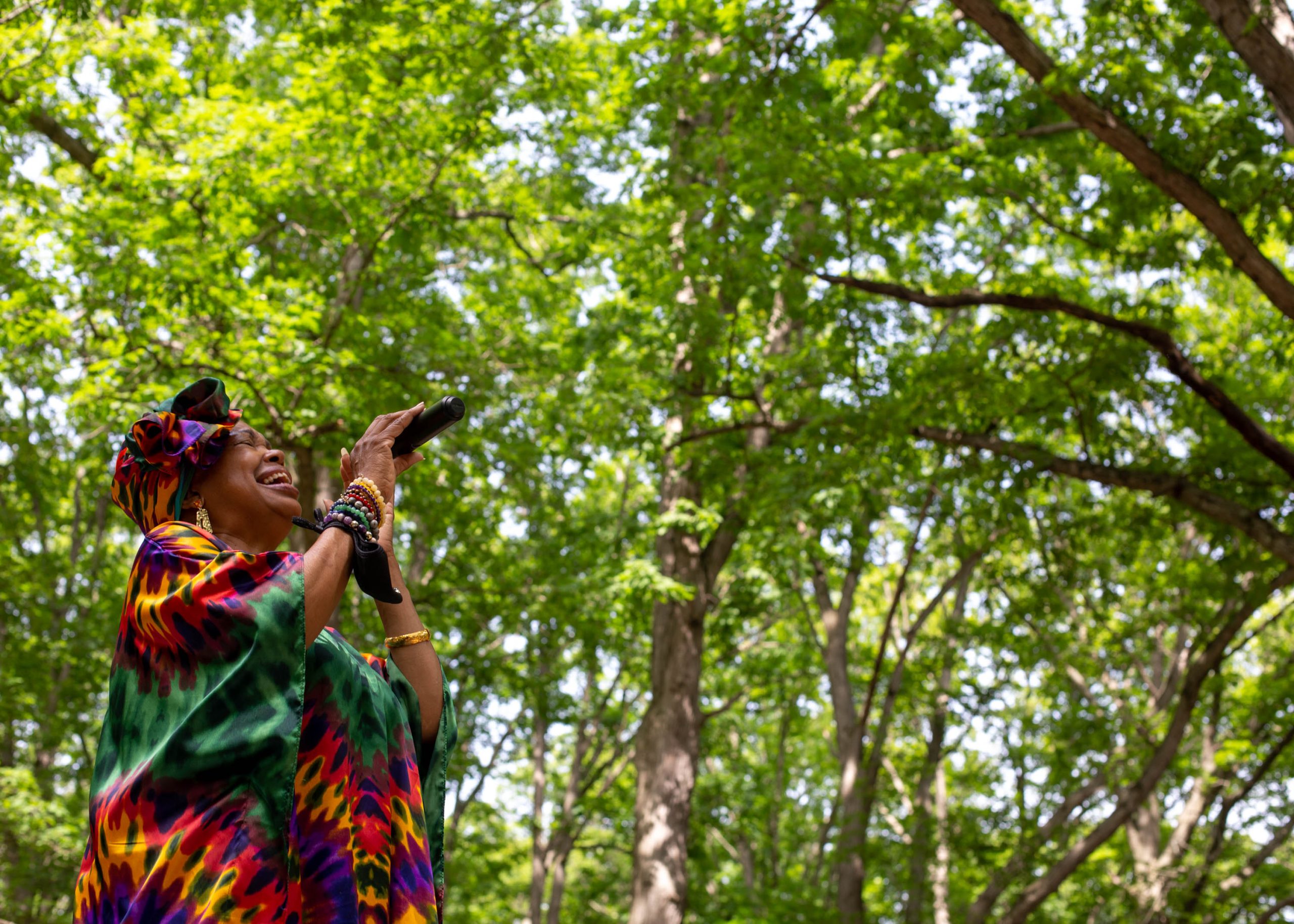 Gwen Pennyman-Hemphill sings during the Juneteenth celebration at Max Brandon Park on the north side of Flint, Mich. on June 19, 2022. (KT Kanazawich | Flint Beat)