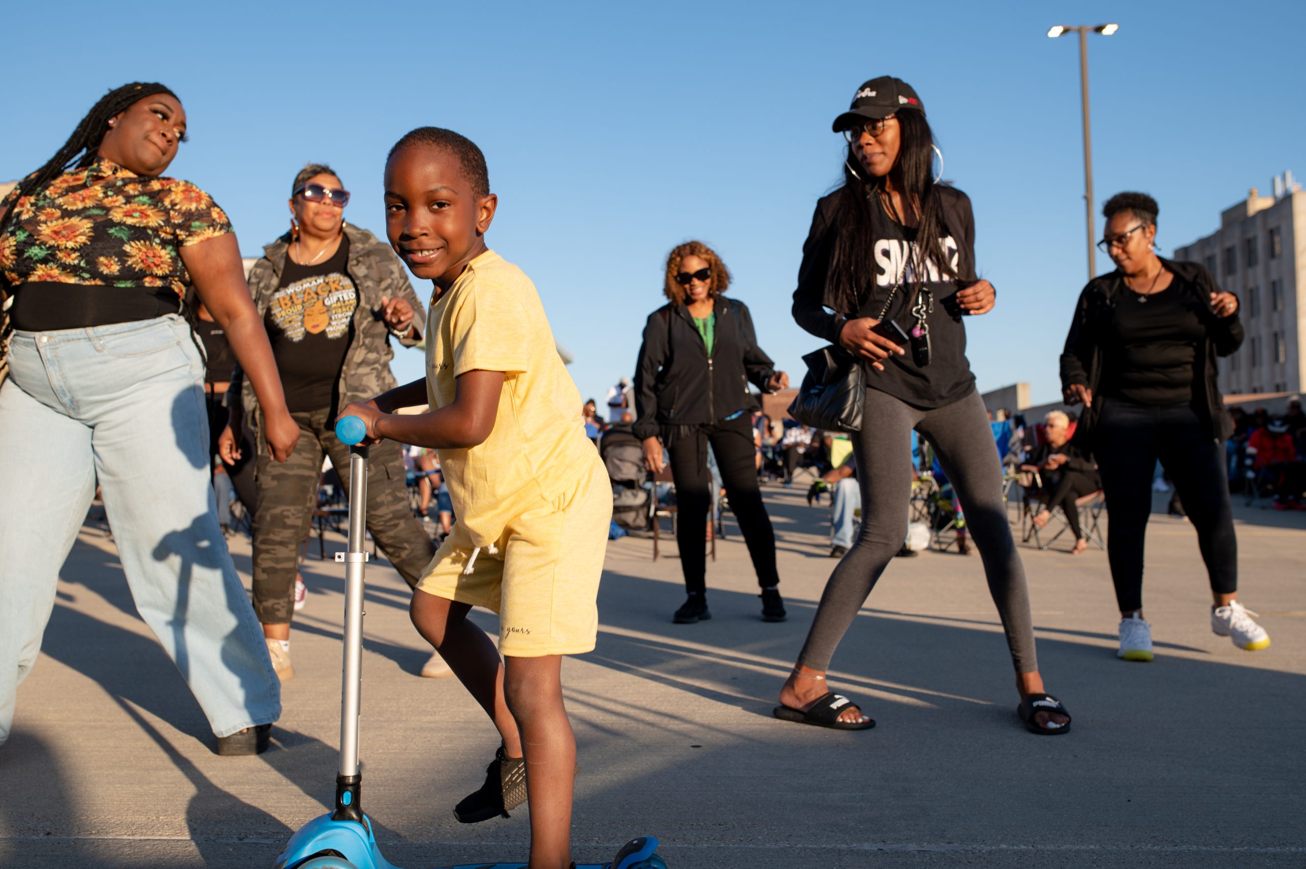 Khari Harden rides by on his scooter while concert-goers dance ahead of Flint musician Mama Sol’s performance on top of the James W. Rutherford Parking Structure in Downtown Flint on Saturday, June 18, 2022. (Michael Indriolo | Flint Beat)