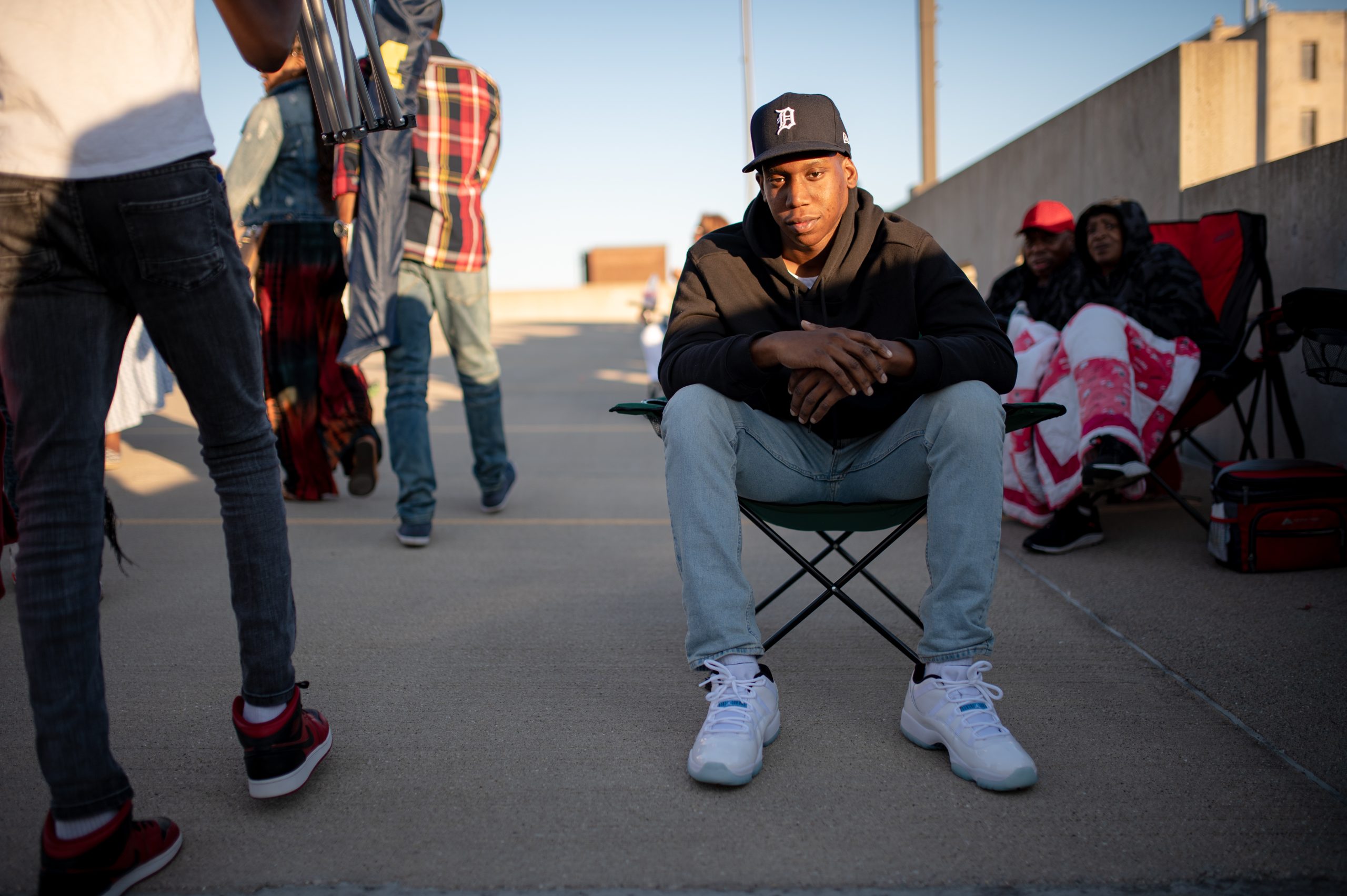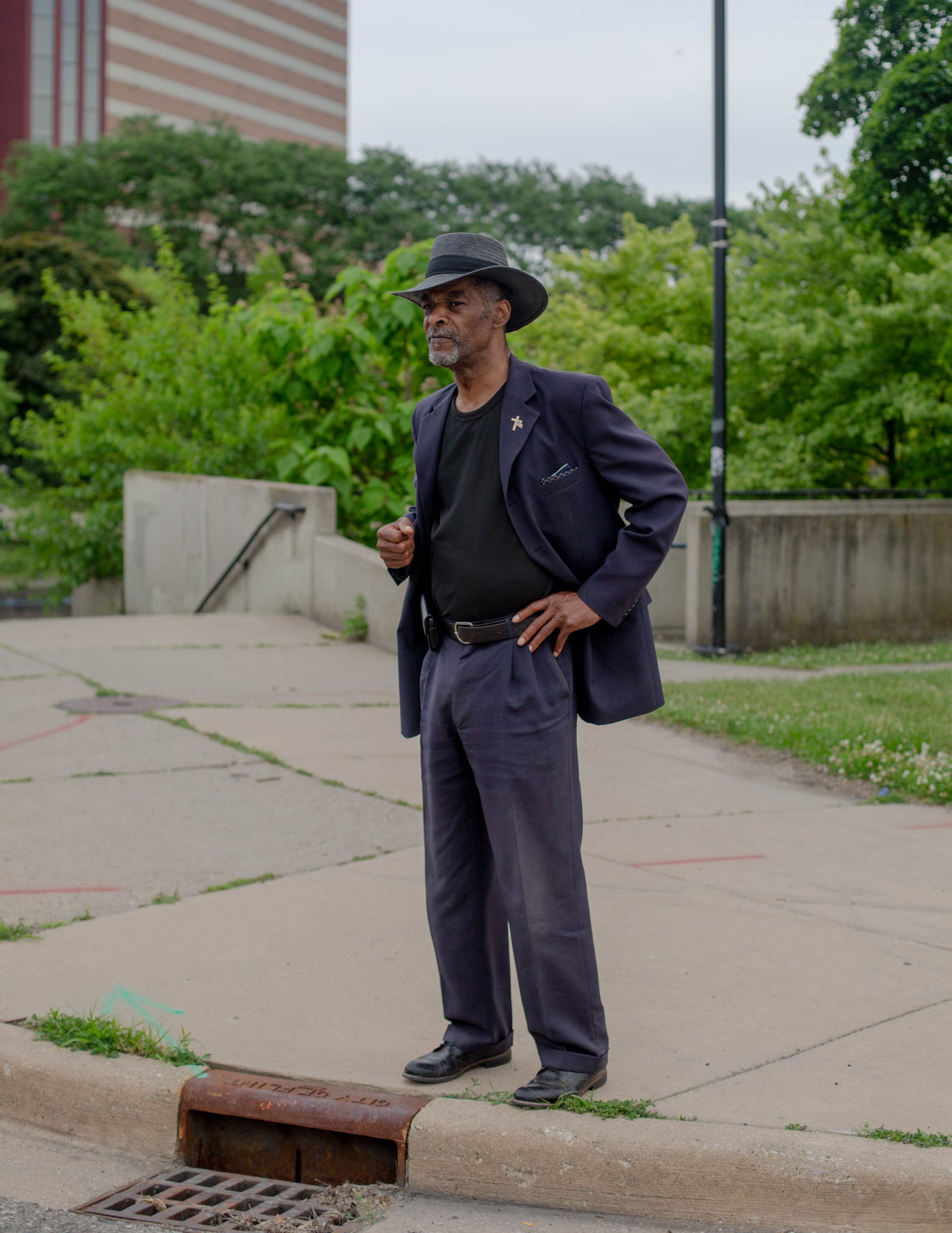 Ronald Hopson poses for a portrait while concert-goers walk past with folding chairs ahead of Flint musician Mama Sol’s performance on top of the James W. Rutherford Parking Structure in Downtown Flint on Saturday, June 18, 2022. (Michael Indriolo | Flint Beat)