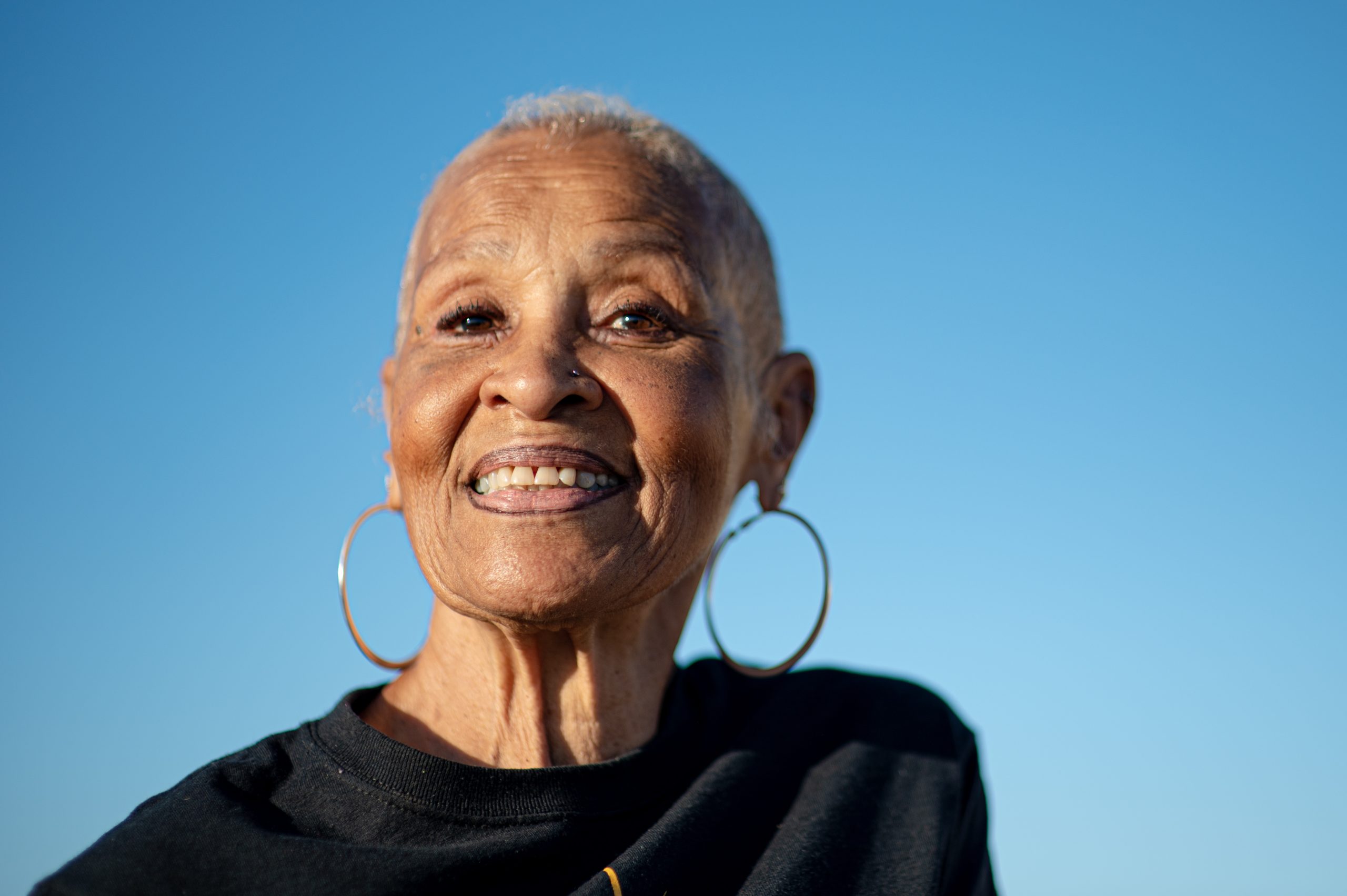 D-D, Flint Musician Mama Sol’s mother, poses for a portrait before her daughter performs on top of the James W. Rutherford Parking Structure in Downtown Flint on Saturday, June 18, 2022. (Michael Indriolo | Flint Beat)