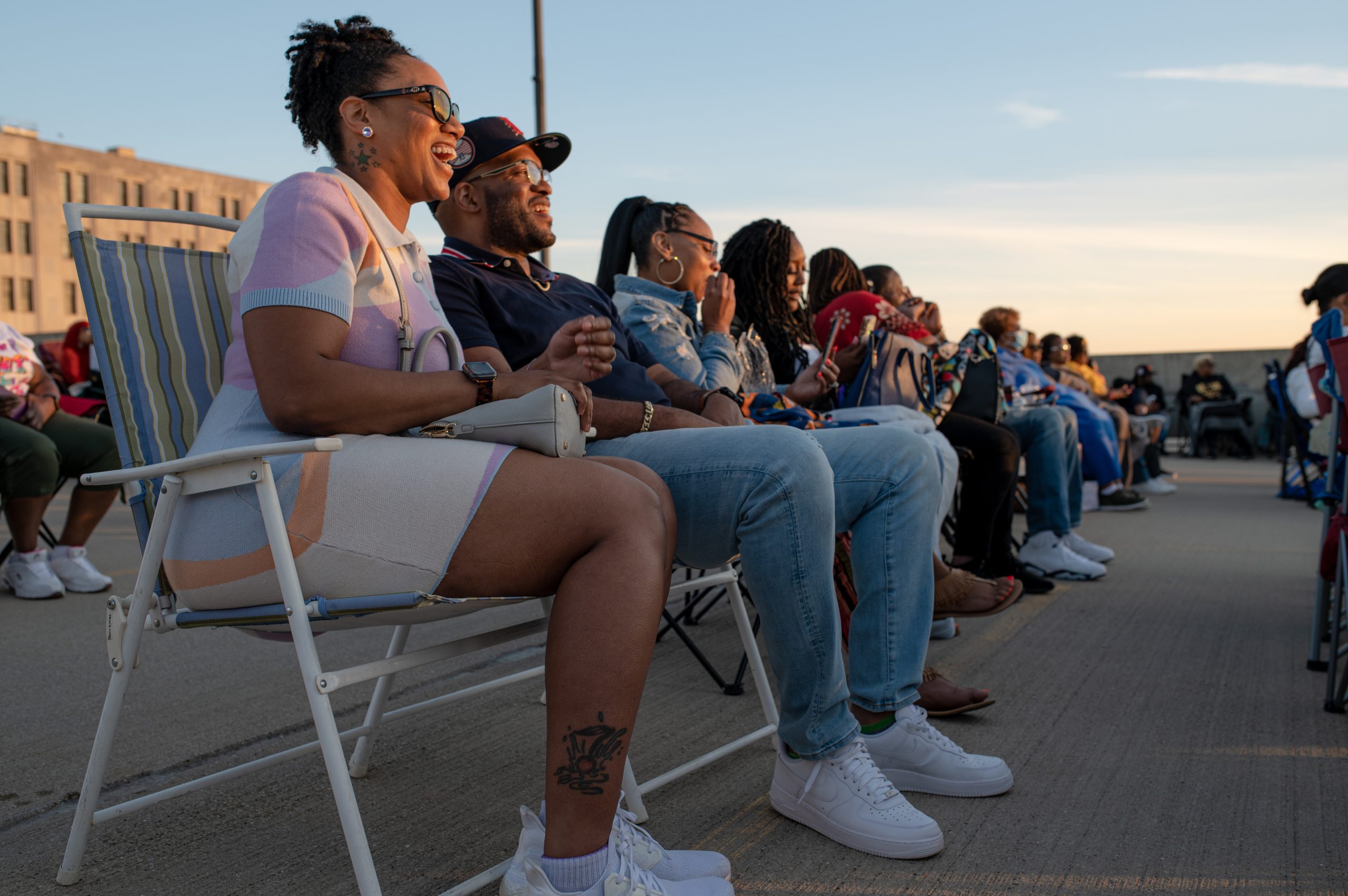 Carissa Bush and Terrance Bush smile as Flint musician Mama Sol’s performance begins on top of the James W. Rutherford Parking Structure in Downtown Flint on Saturday, June 18, 2022. (Michael Indriolo | Flint Beat)
