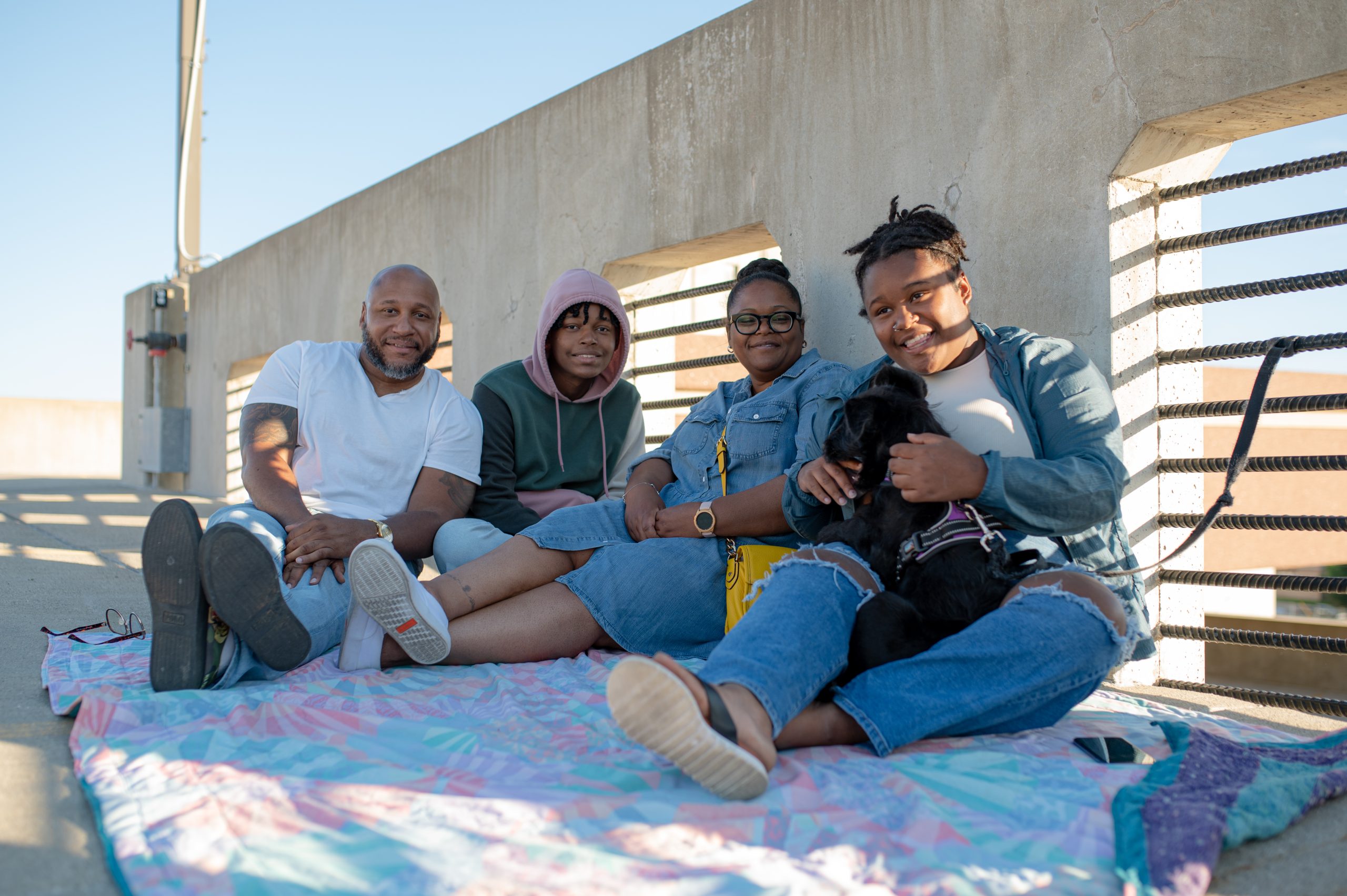 Kyle Cochran, Ari Cochran, Vina Cochran and Tristen Cochran relax on a blanket before Flint musician Mama Sol’s performance on top of the James W. Rutherford Parking Structure in Downtown Flint on Saturday, June 18, 2022. (Michael Indriolo | Flint Beat)