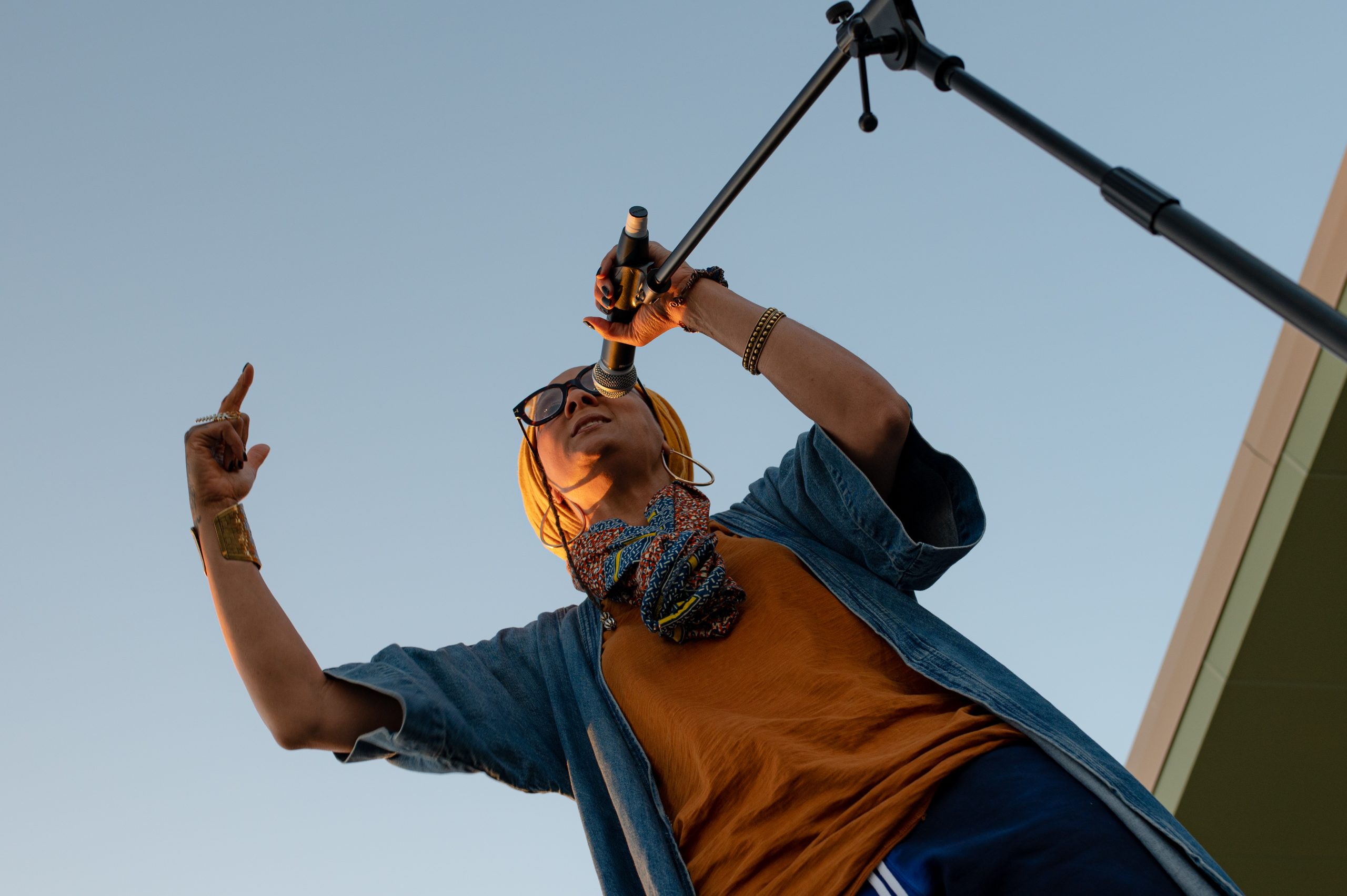 Flint musician Mama Sol speaks about the importance of caring for the youth after calling up her son Wasir James and his friends Kevin Tiggs Jr., Damarcus Burke Jr., Shawk Holbrook and Isaiah Smith during her performance on top of the James W. Rutherford Parking Structure in Downtown Flint on Saturday, June 18, 2022. (Michael Indriolo | Flint Beat)Flint musician Mama Sol performs on top of the James W. Rutherford Parking Structure in Downtown Flint on Saturday, June 18, 2022. (Michael Indriolo | Flint Beat)