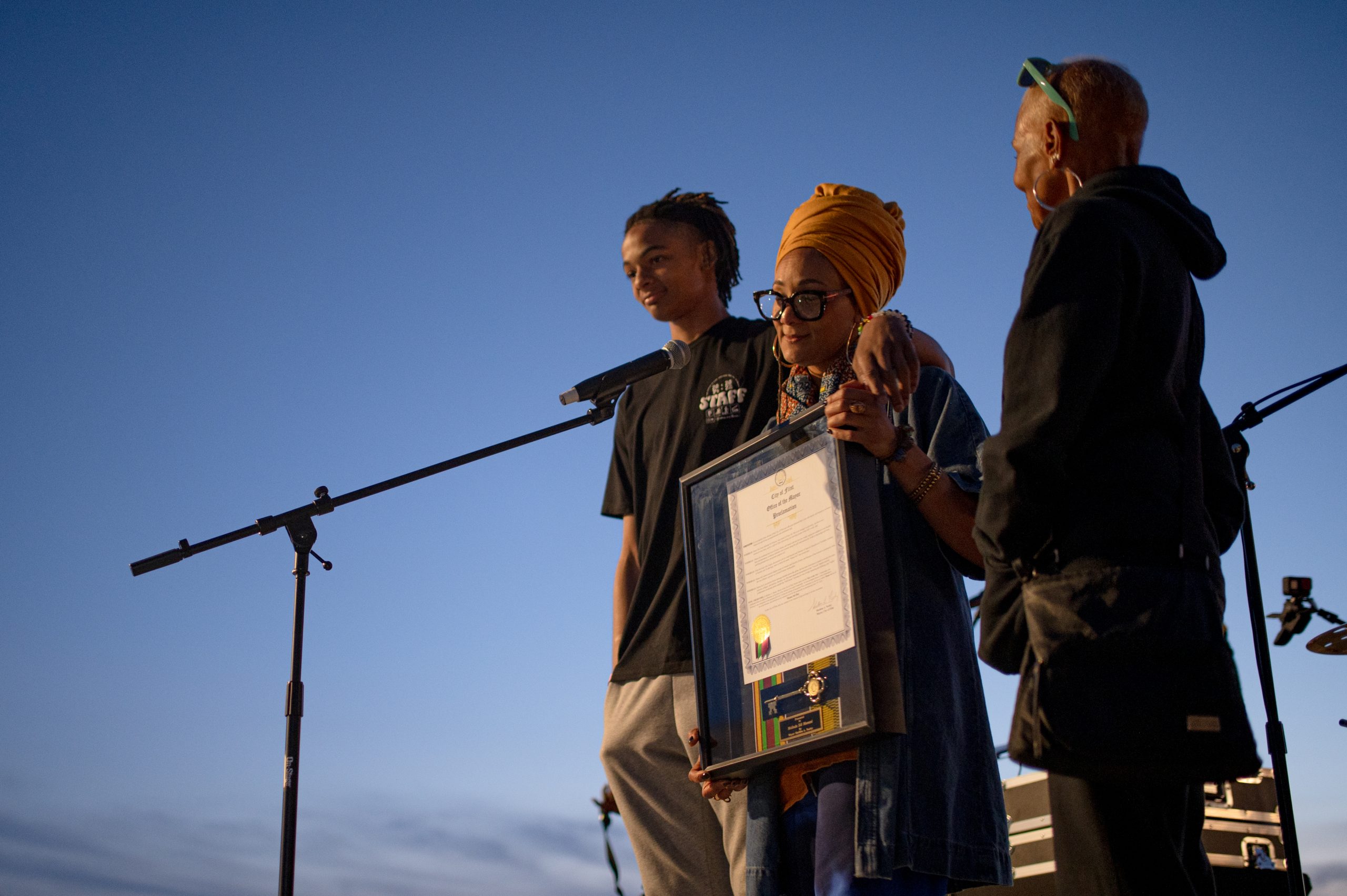 Flint Musician Mama Sol stands on stage with her mother D-D and her son Wasir James after Mayor Sheldon Neeley presented her a key to the city during her performance on top of the James W. Rutherford Parking Structure in Downtown Flint on Saturday, June 18, 2022. (Michael Indriolo | Flint Beat)