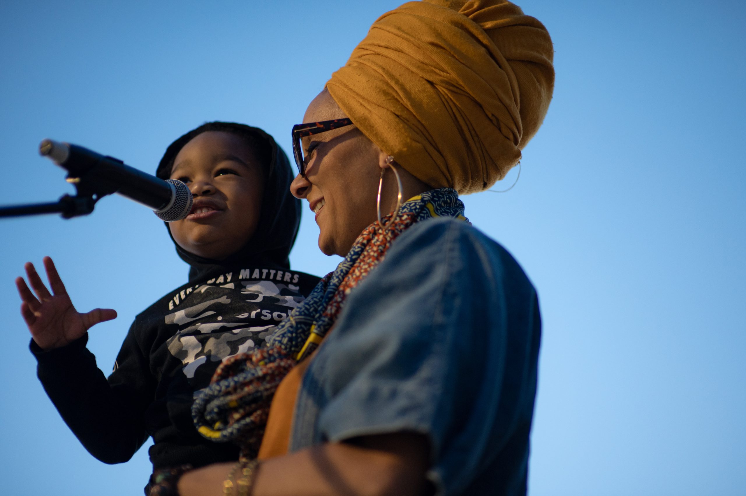Flint musician Mama Sol guides Baby Alex through a song during during her performance on top of the James W. Rutherford Parking Structure in Downtown Flint on Saturday, June 18, 2022. She called him up after seeing him dance near the stage. (Michael Indriolo | Flint Beat)