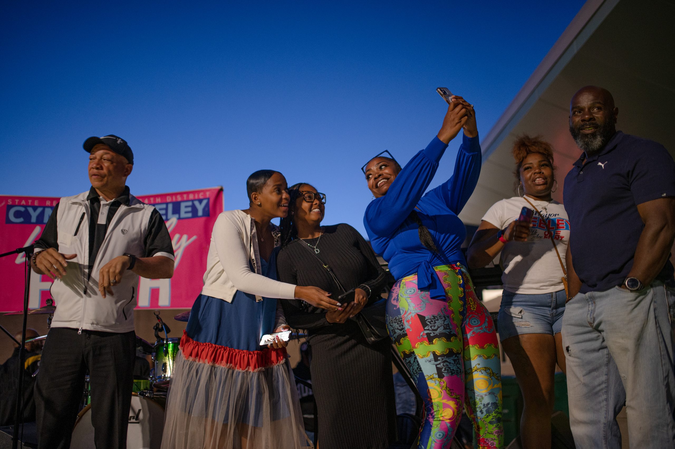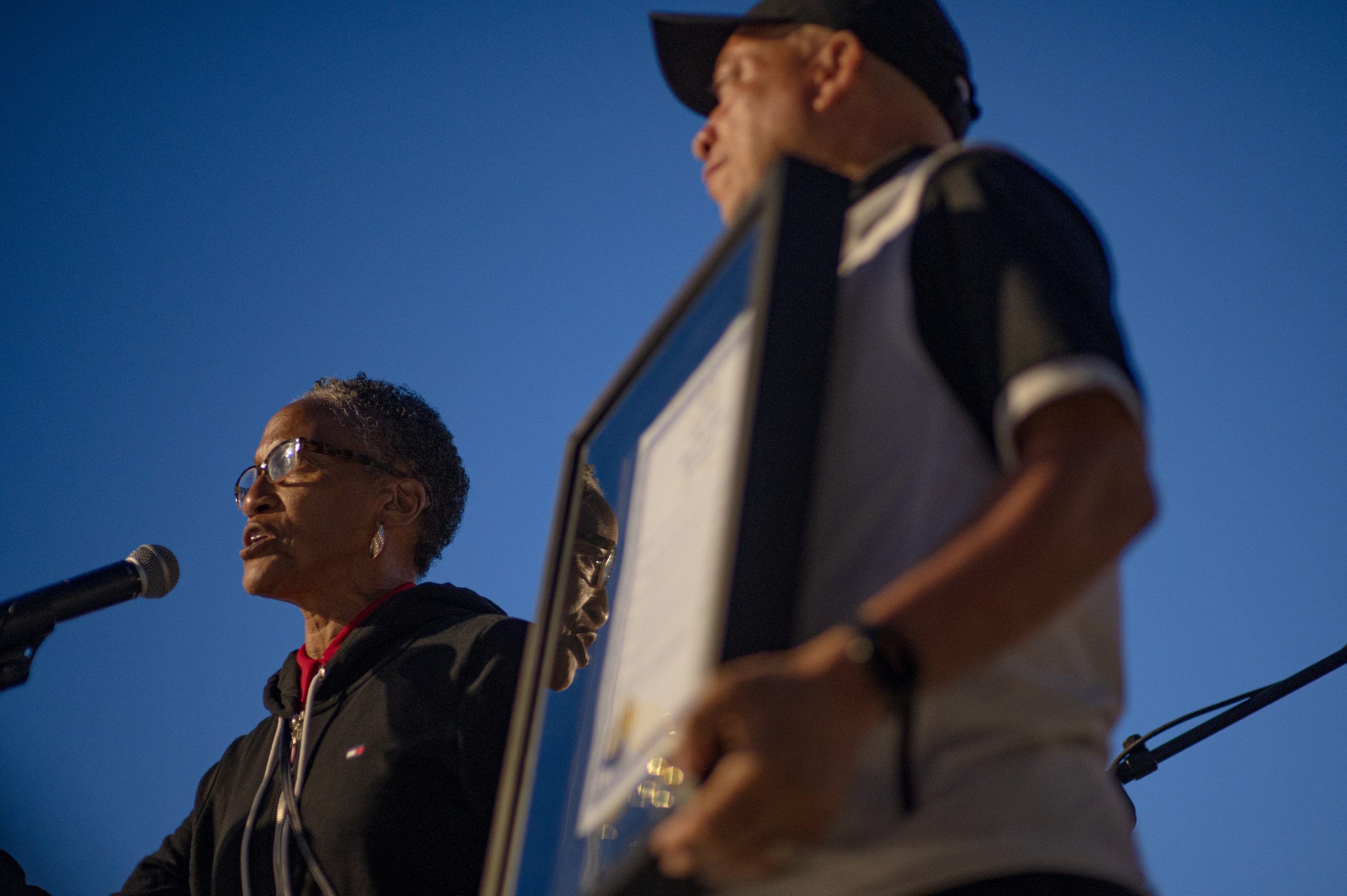 Linnell Jones-McKenney, Flint’s first professional female basketball player and longtime coach, gives a speech as Mayor Sheldon Neeley presents her with a key to the city during Flint Musician Mama Sol’s performance on top of the James W. Rutherford Parking Structure in Downtown Flint on Saturday, June 18, 2022. In her position as athletics program director at the Sylvester Broome Empowerment Village, Jones-McKenney organizes sports programs for student athletes. (Michael Indriolo | Flint Beat)Event organizer April Cook-Hawkins takes a selfie on stage after Flint Musician Mama Sol’s performance on top of the James W. Rutherford Parking Structure in Downtown Flint on Saturday, June 18, 2022. Cook-Hawkins’s husband Jeff Hawkins and his daughter Ariana Hawkins stand to the right while Mayor Sheldon Neeley stands on the left. (Michael Indriolo | Flint Beat)