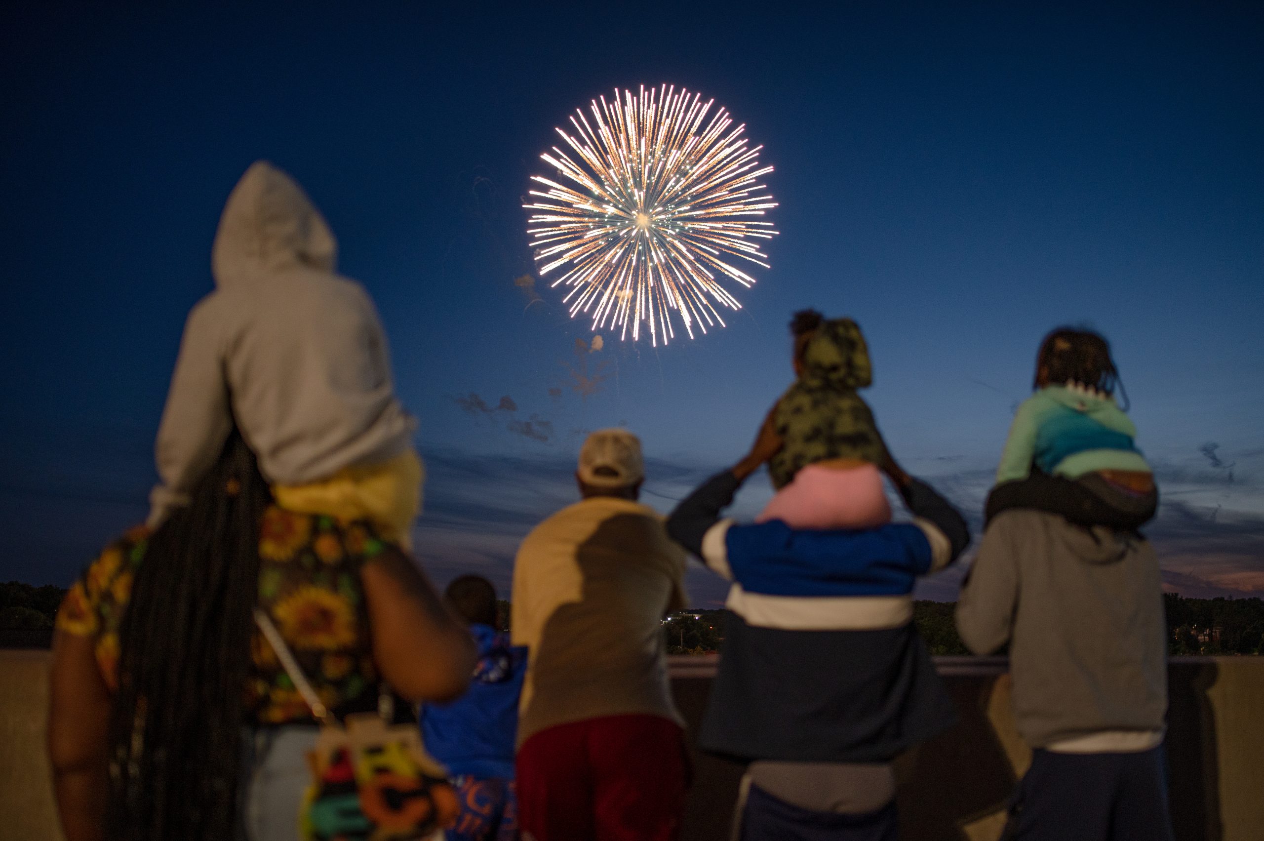 DJ Washington, Dream Washington, Kayden Washington, Tristan Nucian, Brandon Hill, Justin Nettles, Khari Harden and Kamora Harden watch fireworks after Flint Musician Mama Sol’s performance on top of the James W. Rutherford Parking Structure in Downtown Flint on Saturday, June 18, 2022. (Michael Indriolo | Flint Beat)
