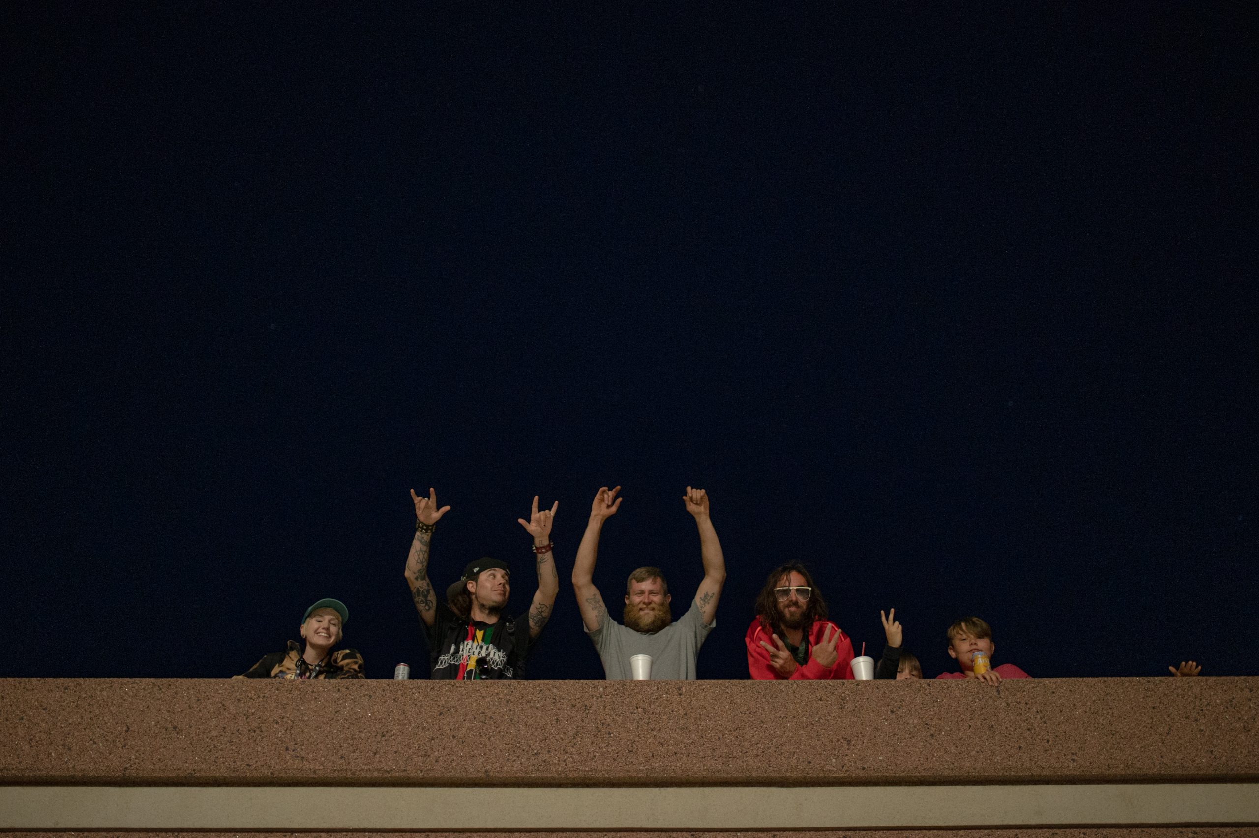 Flint artist Pauly M. Everett, Michael Everett, Vinnie Sturgess and others pose for a portrait during the fireworks show following Flint Musician Mama Sol’s performance on top of the James W. Rutherford Parking Structure in Downtown Flint on Saturday, June 18, 2022. (Michael Indriolo | Flint Beat)