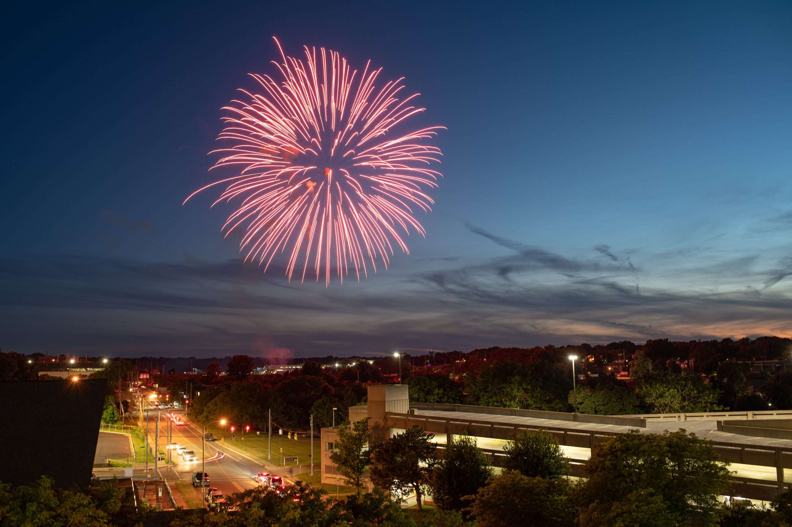 A firework lights up the sky after Flint Musician Mama Sol’s performance on top of the James W. Rutherford Parking Structure in Downtown Flint on Saturday, June 18, 2022 (Michael Indriolo | Flint Beat)
