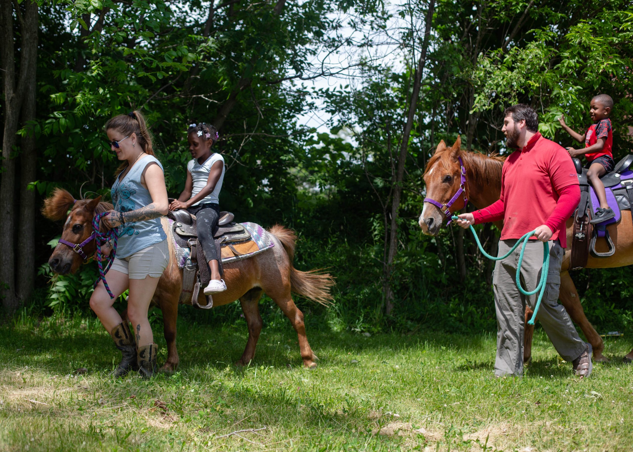Cay’dence Moore, 7, of Flint, rides a pony on the north side of Flint, Mich. during the Claressa Shields street renaming event on June 19, 2022. (KT Kanazawich | Flint Beat)